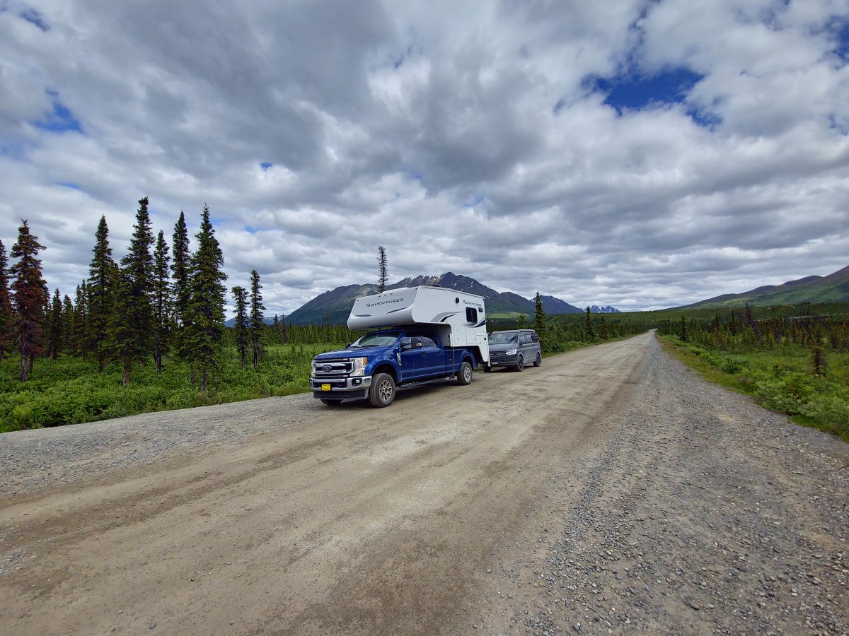 Unsere Kollegen sind Frühaufsteher, wir leider weniger. Selbstverständlich finden wir einen Kompromiss und fahren am nächsten Morgen pünktlich (ganz schweizerisch 😉) um 08:00 Uhr weiter Richtung Denali Nationalpark. Wir nehmen uns viel Zeit um Fotos von der Landschaft zu machen und versuchen unsere Kollegen für das Wildcampen zu begeistern. Wir finden dann in der Nähe des Nationalparks auch einen passablen Platz. Da uns wie immer die Mücken plagen machen wir es uns im Camper der Kollegen gemütlich. Es wird ein weiterer unvergesslicher lustiger Abend, nur dieses Mal gehen wir als Looser ins Bett.