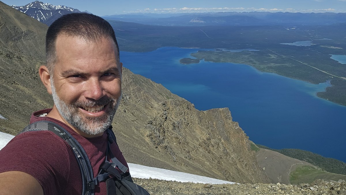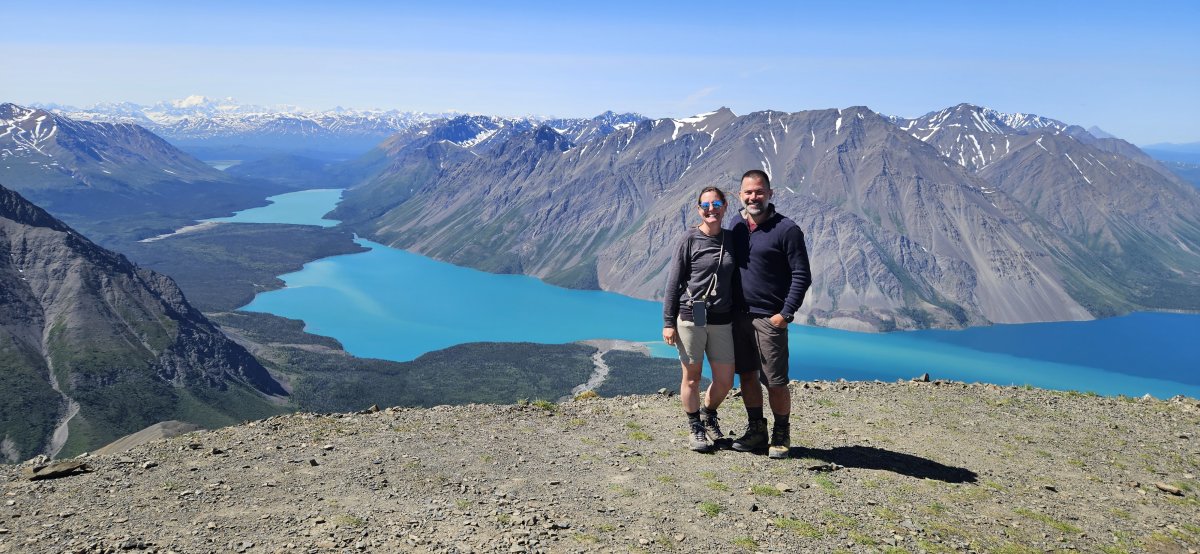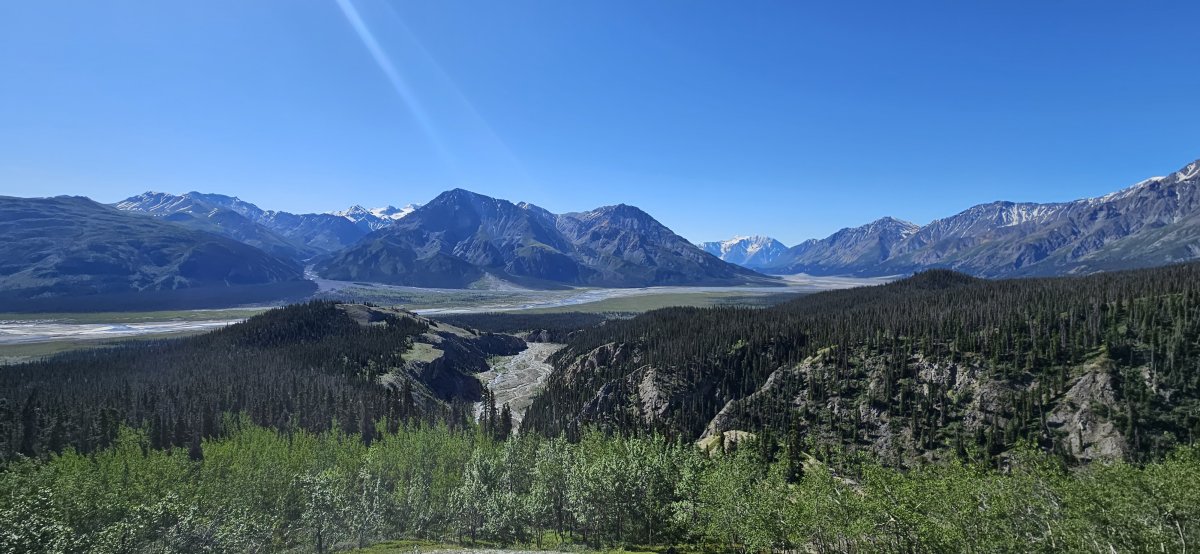 Das Wetter bleibt perfekt und wir machen eine Wanderung zum Kings throne summit. Auf halben Weg treffen wir auf Kayla von Halifax. Sie ist alleine unterwegs und nutzt ihre freien Tage um die Gegend zu erkunden. In vier Tagen startet sie als Krankenschwester in einem Jugendcamp der Armee Kanadas. Der Aufstieg wird dank ihrer Gesellschaft ganz kurzweilig und nach etwas mehr als drei Stunden haben wir den Peak erreicht. Ohne uns hätte sie die Wanderung in der Hälfte abgebrochen. Wäre ganz schade gewesen, denn die Aussicht auf den Mount Logan (mit 5'959 m höchster Berg Kanadas) ist selten und wunderschön.