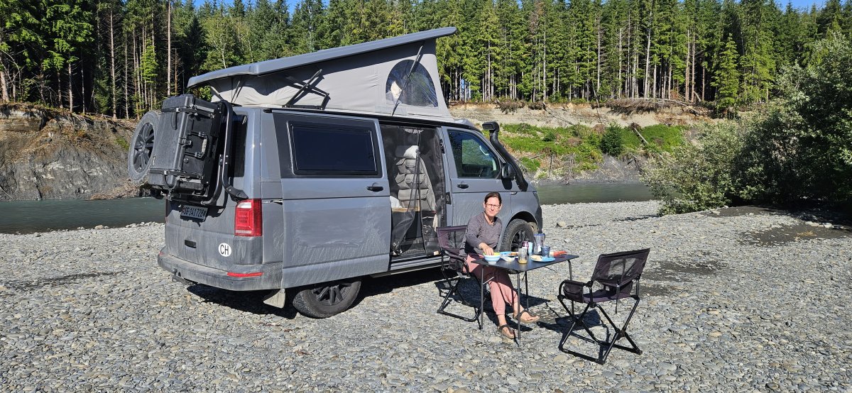 Wir übernachten zwei Nächte auf einem Privatgrundstück beim Park. Lustigerweise ist es an diesem Fluss jeweils schönes Wetter und heiss. An der Küste wird es aufgrund des Windes schnell neblig und kühl.