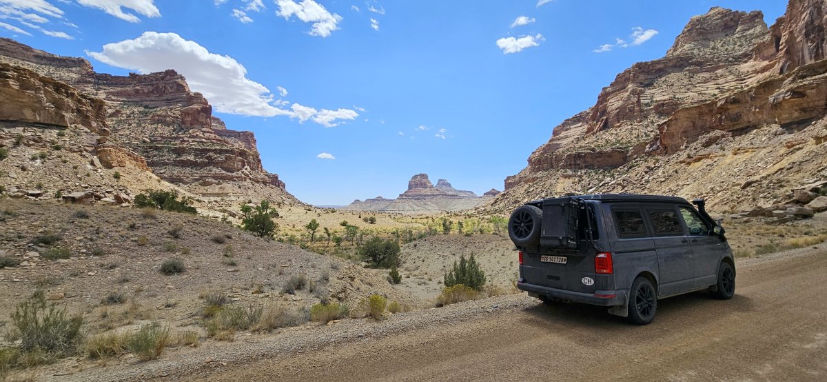 Unser nächste Schlafplatz befindet sich an einer Offroadstrecke die zu den Gemini Brücken führt. Da das Gelände sehr steil und steinig ist, lassen wir erst mal etwas Luft ab. Der Aufstieg ist nicht ganz einfach und Ramon steht oft ganz schräg. Simone steigt auch lieber aus und macht Videos und Fotos. Im Auto schwitzt sie fast mehr wie beim nebenher joggen bei 39° C Aussentemperatur. Joos bleibt da locker. Wird schon nicht schief gehen. Die Strecke zu fahren hat sich jedenfalls gelohnt. Die Aussicht während der Fahrt ist super. Ganz bis zu den Bridges schaffen wir es dann doch nicht – vielleicht wäre es schon gegangen, Simone war es aber nicht wohl dabei. Deshalb fahren wir zu unserem Stellplatz. Dieser ist zwar auch schön, kann aber mit dem Little Grand Canyon bei weitem nicht mithalten. Da sich der Platz direkt an einer Felswand befindet ist es auch sehr sehr heiss. Eine zweite Nacht bleiben wir bestimmt nicht.