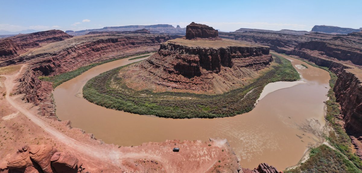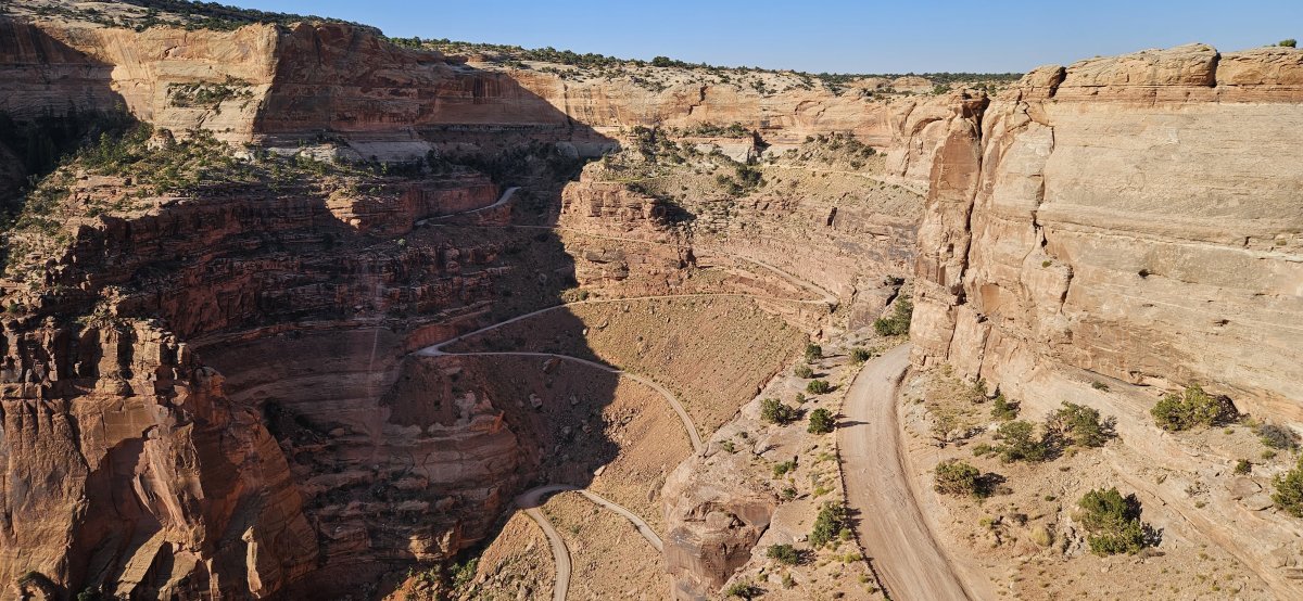 Das Highlight des Canyonland Nationalparks sind die vielen Offroadstrecken die man fahren kann. Für diese benötigt man allerdings eine Bewilligung und viel viel Zeit da diese über 100 km lang sind und man gezwungenerweise im Park übernachten muss. Auch für diese Übernachtungen benötigt man selbstverständlich eine Bewilligung die pro Nacht zirka 40$ kostet. Zeit hätten wir, trotzdem entscheiden wir uns für den Shafer Trail, der nur ein kurzes Stück durch den Nationalpark, über die Potash Road nach Moab führt. Diese Strecke ist nicht bewilligungspflichtig und trotzdem 30 Kilometer lang, nicht so anspruchsvoll, dass sogar Simone fahren kann und super schön. Sobald man aus dem Park raus ist, darf man auch die Drohne fliegen lassen. Diese Chance nutzen wir.