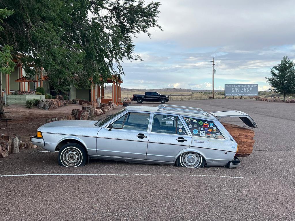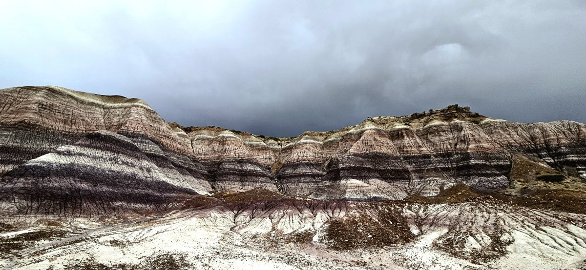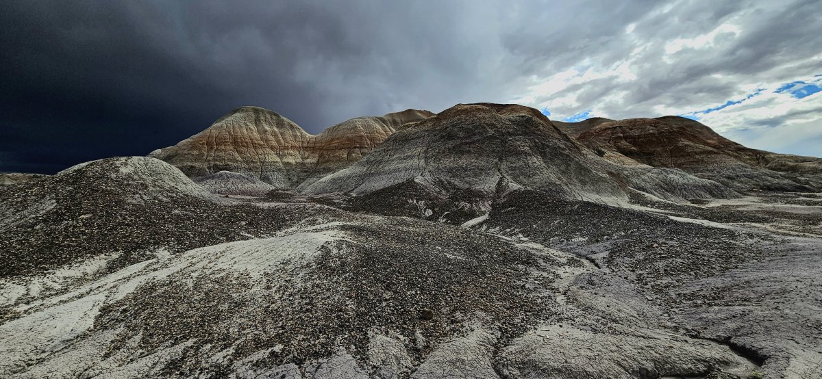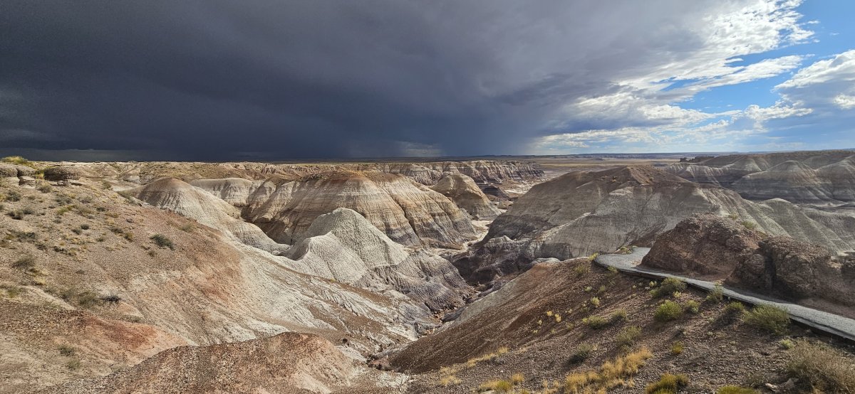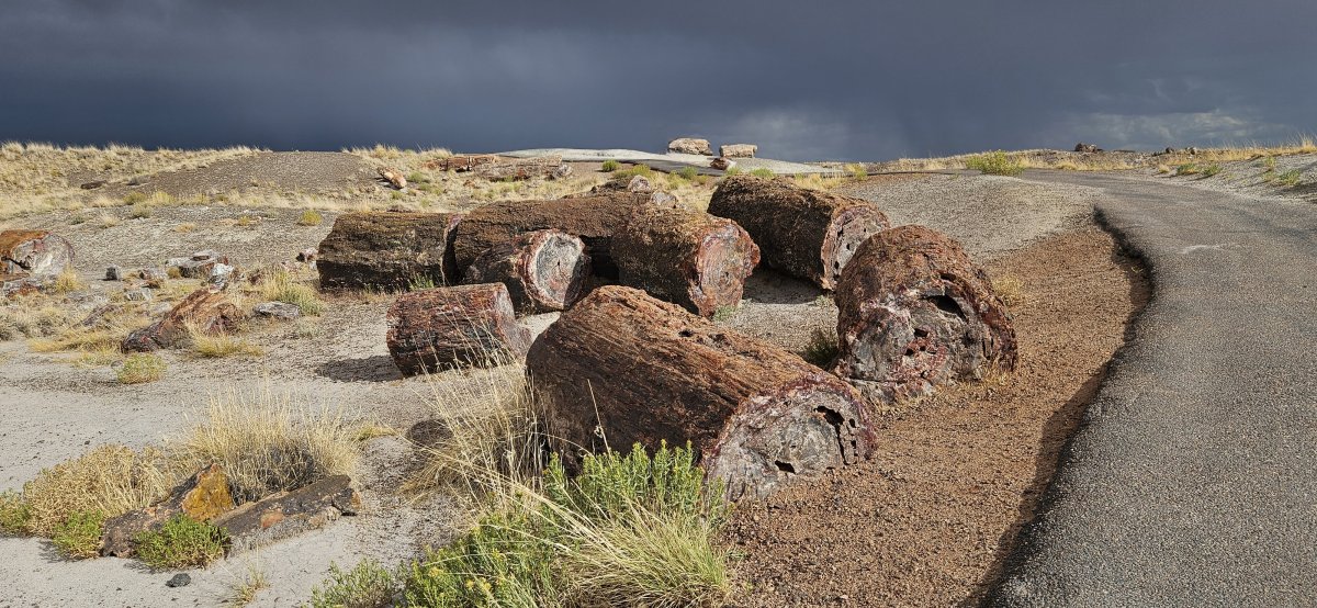 Wir entscheiden uns wieder Richtung Westen zu fahren. Mit der Zeit sieht auch alles wieder ähnlich aus. Wir sehnen uns nach Wasser, einem See, einem Meer, einem Fluss mit Wasser oder nach einem Pool. Deshalb fahren wir Richtung Phoenix zu unseren Bekannten. Da sollen auch bald unsere neuen Pneus eintreffen. Diese haben nach unseren Offroadtouren wieder gelitten und sind bald überfällig. Der Petrified Forest ist ein kleiner Nationalpark der in den Badlands liegt. Insbesondere die Farben der Sandsteine beeindrucken uns. Die Farben wechseln je nach Sonneneinfall. Wir haben Glück und ein Gewitter zieht auf. Das lässt die Farben nochmals anders aussehen. Neben den Badlands gibt es natürlich auch noch die versteinerten Bäume die zu sehen sind. Diese haben dem Park ja auch den Namen gegeben.