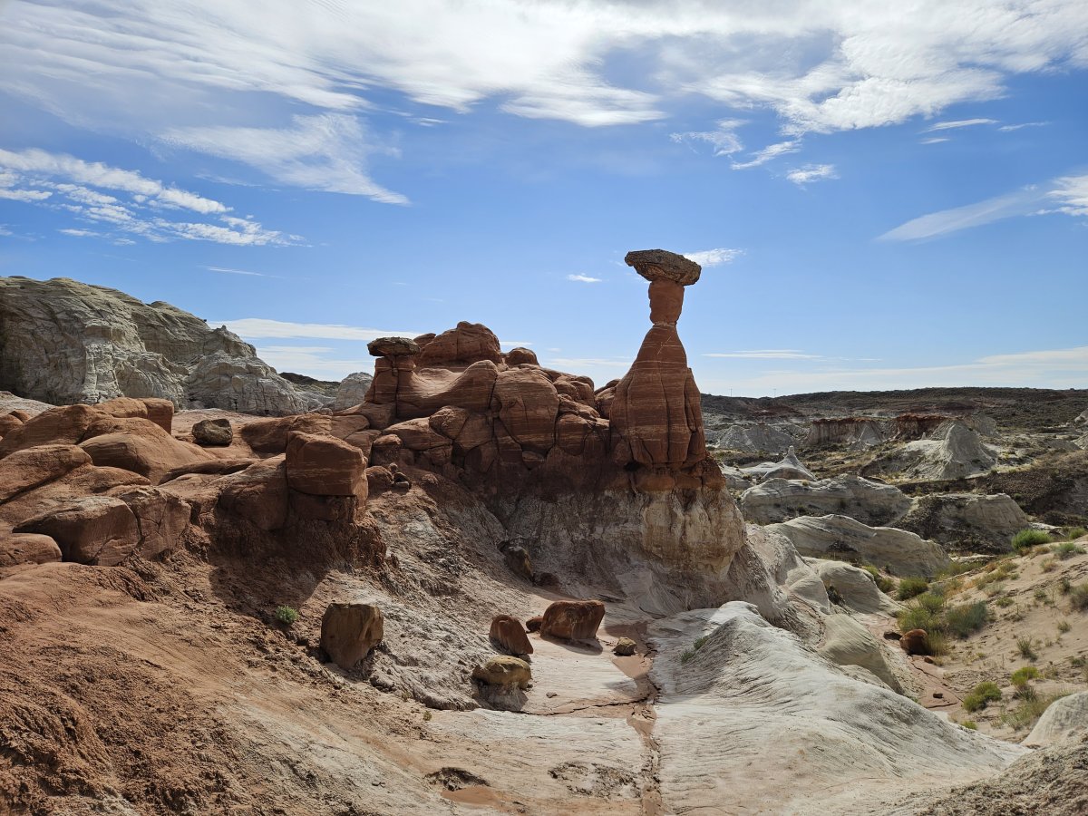 Zu den Toadstool Hoodoos ist es nur eine kurze Wanderung. Die Wege sind noch ganz nass und teils sumpfig. Über den Hinweis, dass man die Wanderwege nicht verlassen darf, müssen wir immer wieder lachen. Dies ist ziemlich schwierig umzusetzen wenn man die raren Markierungen die den Weg weisen sollten nicht findet. Bei den Stools treffen wir eine Fotografengruppe die uns Tipps für ein schönes Foto geben.