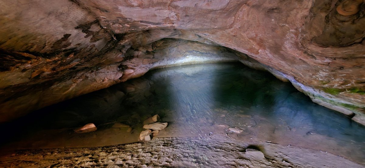 Der Hidden Lake befindet sich unter schönen Sandsteinformationen. Der See ist ganz im dunkeln deshalb getrauen wir uns nicht so nah hin. In der Höhle ist es aber eher frisch.