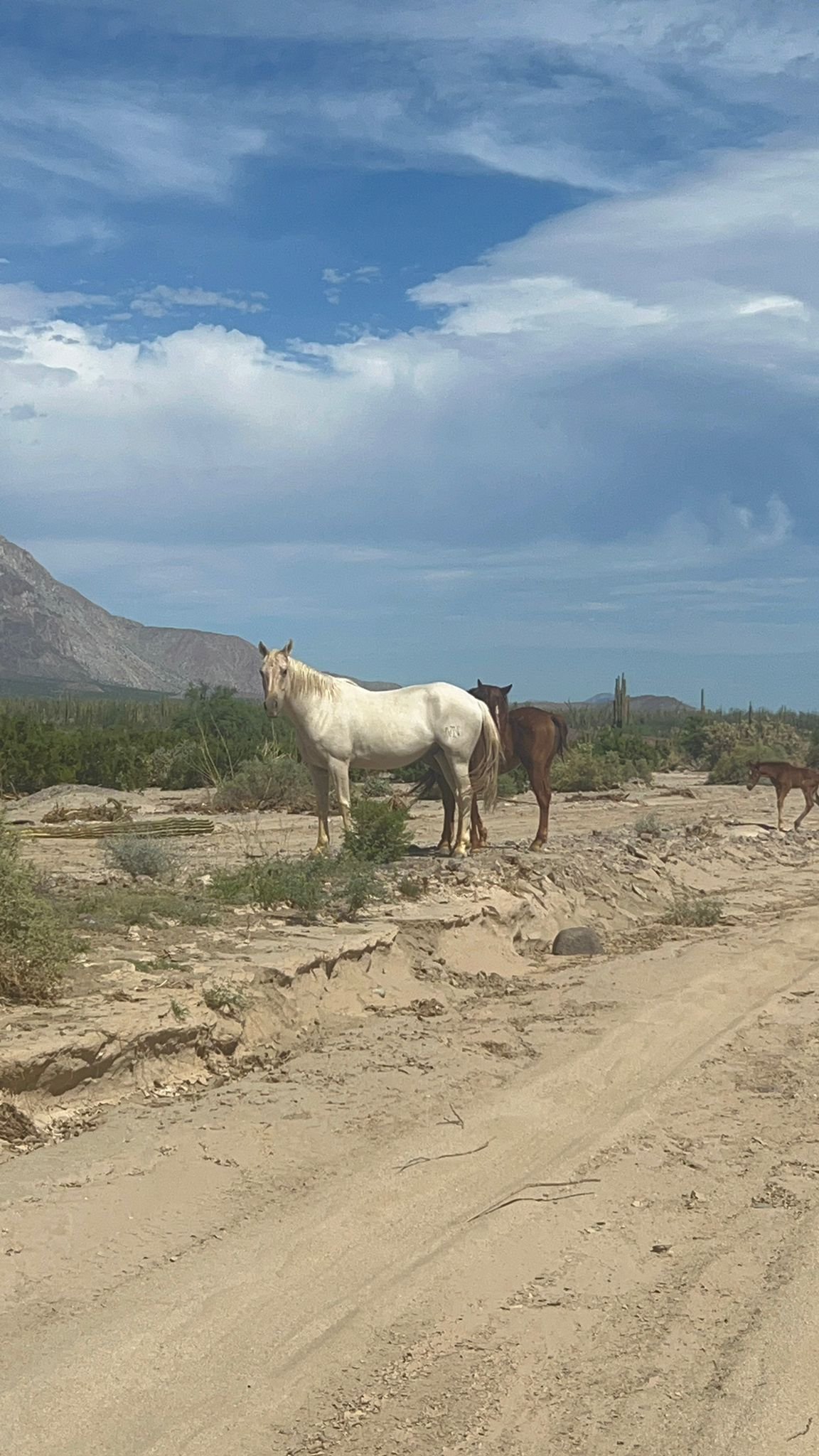 Von Bahia de los Angeles wollen wir via 140 Km lange Offroadstrecke nach Piedra Blanca. Aufgrund des Hurricanes ist die Piste allerdings in einem sehr schlechten Zustand. Da man im Dorf keinen Diesel tanken kann und der Camping, den wir ursprünglich anpeilen wollten kürzlich geschlossen wurde, drehen wir nach einigen Kilometern wieder um. Es ist ziemlich uncool in der Wüste steckenzubleiben. Wir kommen trotzdem Beide auf unsere Kosten – Joos beim Fahren und Simone sieht einige Wildpferde.
