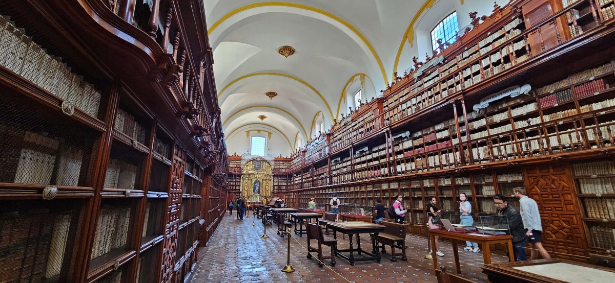 Der Grossvater von Pablo hat uns die Bibliothek von Puebla empfohlen. In der Bibliothek sollen über 40 Tausend alte Bücher gelagert sein. Der einzige Unterschied zur Stiftsbibliothek in St. Gallen ist wohl, dass die Bücher in Spanisch geschrieben sind und der Boden aus Stein. Aber sonst kann die Bibliothek locker mit St. Gallen mithalten.