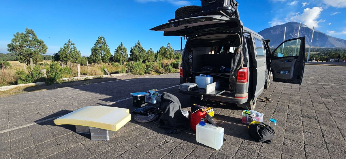 Wir entschliessen uns im Internet zu prüfen ob man den Eintritt auch online zahlen kann. Da wir keine Daten mehr haben holen wir das erste Mal unser neues Spielzeug «Starlink» hervor. In diesem Moment entdecken wir, dass der ganze Kofferraum inklusive Bett alles nass ist. Nein, es ist nicht die neue Wasserpumpe die Joos installiert hat – ein nicht ganz verschlossener Wassersack hat diese Sauerei verursacht. Wir räumen alles aus und versuchen, so viel wie möglich an der Sonne zu trocknen.