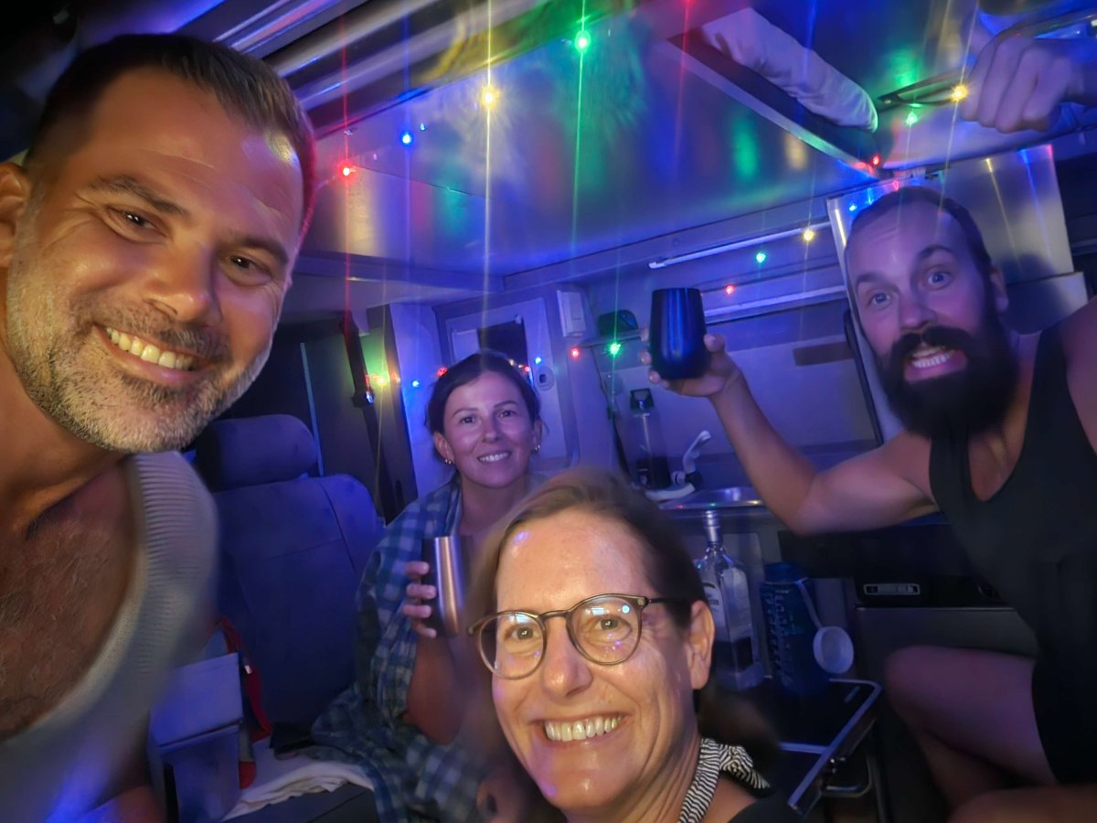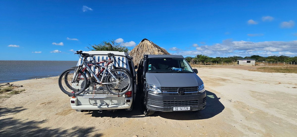 Das war ja mal nicht so schlimm wie erwartet. Trotzdem kommen wir ziemlich spät bei der Laguna an. Obwohl der Himmel ganz klar ist stürmt es ganz fest. So fest, dass es unmöglich ist draussen zu sitzen. Damit wir den Abend trotzdem mit Jason und Hannah verbringen können, parken wir ganz nahe zusammen und lassen unsere Seitentüren offen – somit haben wir ein vergrössertes Wohnzimmer und können sogar zusammen kochen.