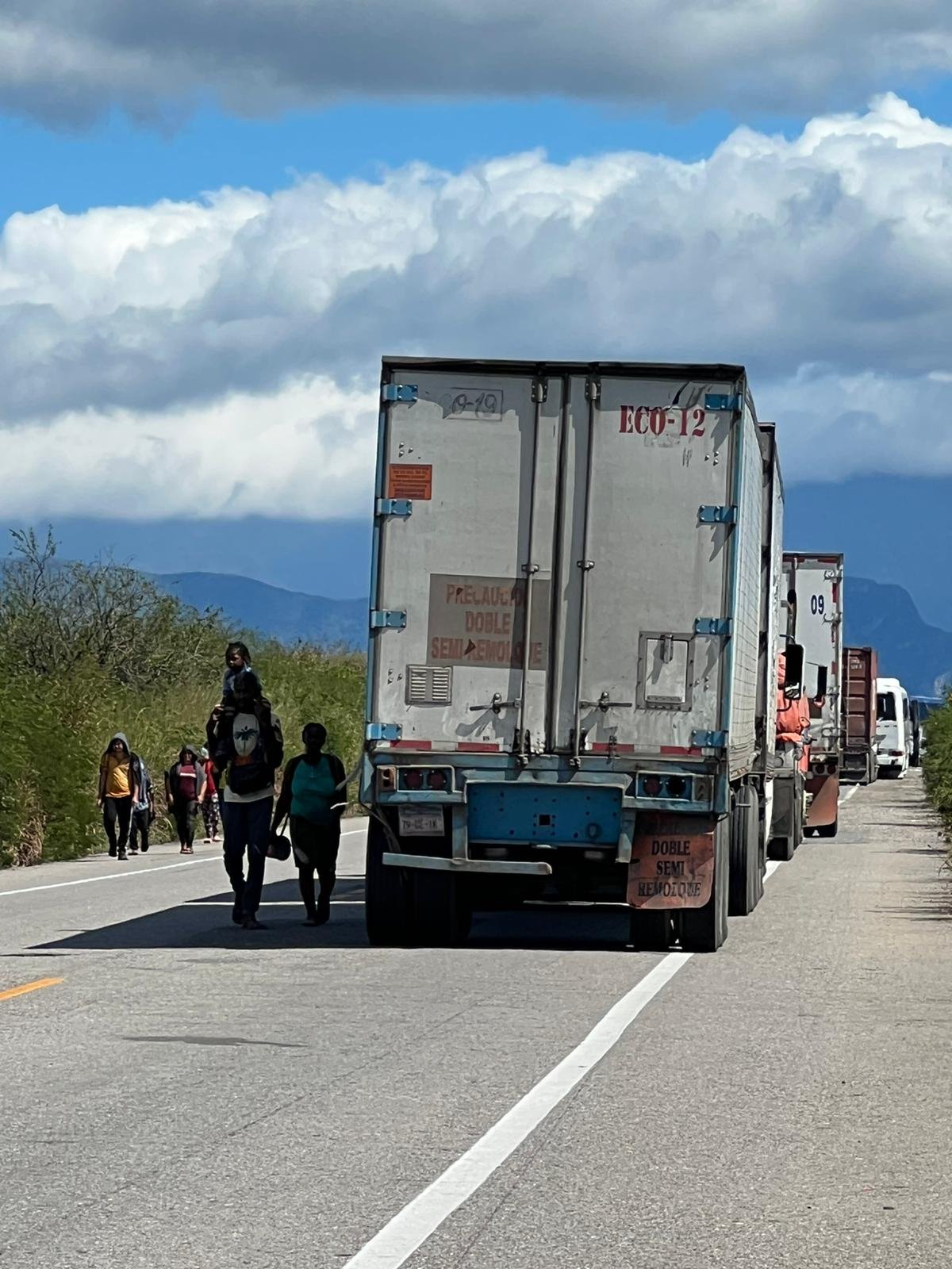 Dieses Mal haben wir leider nicht so Glück. Wir warten über drei Stunden bis wir endlich weiterfahren können. Glücklicherweise befindet sich die Blockade auf einer Brücke bei Colonia Rio Osuta – wir können im Schatten unter der Brücke am Fluss warten und noch etwas Essen. Wir sind nicht alleine, viele Flüchtlinge aus Honduras baden und waschen sich im Fluss. Die Kinder sind schnell bei uns und wollen Essen. Insgesamt sehen wir mindestens 300 Flüchtlinge auf dieser Strasse. Entweder am Laufen oder zusammen mit Schleppern zu dritt oder zu viert auf dem Töff oder in vollgestopften Autos. Insbesondere die vielen Kinder tun uns sehr leid.