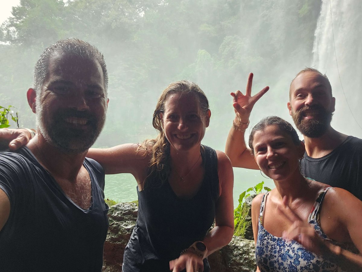 Der Wasserfall ist super toll. Man kann auch hinter den Wasserfall klettern und etwas weiter oben gibt es eine kleine Höhle und weitere kleine Wasserfälle. Bis wir die Einheimischen überzeugt haben, dass wir keinen Führer benötigen da wir auf uns selbst aufpassen können (für 100 Pesos ist dann auch die Sicherheit ohne Führer gegeben - komisch) und alle Fotos gemacht haben, ist es bereits Nachmittag und schon zu spät um an die Grenze zu fahren.