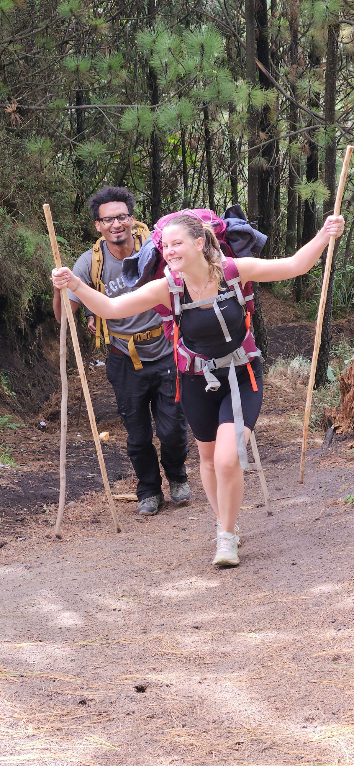 Wir wollen die Vulkane Acatenango und Fuego besteigen und auch da übernachten. Uns erwarten also zwei strenge Wandertage. Leider geht es Joos nicht gut und wir sind nicht sicher, ob er überhaupt mitkommen kann. Denn seit dem Horrordurchfalltag in Mexico geht es uns gesundheitlich immer mal wieder gut, oder eben nicht so gut. Wobei Joos viel mehr leidet als Simone. Joos entscheidet, dass er sich die Vulkane auf keinen Fall entgehen lassen möchte und kommt mit. Die Meisten der Wandergruppe arrangieren einen Träger um das ganze Gepäck für zwei Tage von einem Einheimischen (im Himalaya wäre das ein Sherpa) auf den Vulkan raufschleppen zu lassen. Wir möchten es ohne Träger versuchen. Es stellt sich schnell heraus, dass das Gepäck schwer, der Aufstieg steil, das Tempo schnell und die Höhe auch nicht zu unterschätzen ist. Nach der ersten Pause engagieren wir einen Träger für den Schwersten unserer Rucksäcke. Joos hat gefühlt zehn Liter Wasser dabei und selbst der Träger findet seinen Rucksack zu schwer. Joos trägt also den leichteren Rucksack von Simone, sie trägt drei Liter Wasser in der Hand und der Träger trägt den immer noch ultraschweren Rucksack von Joos.