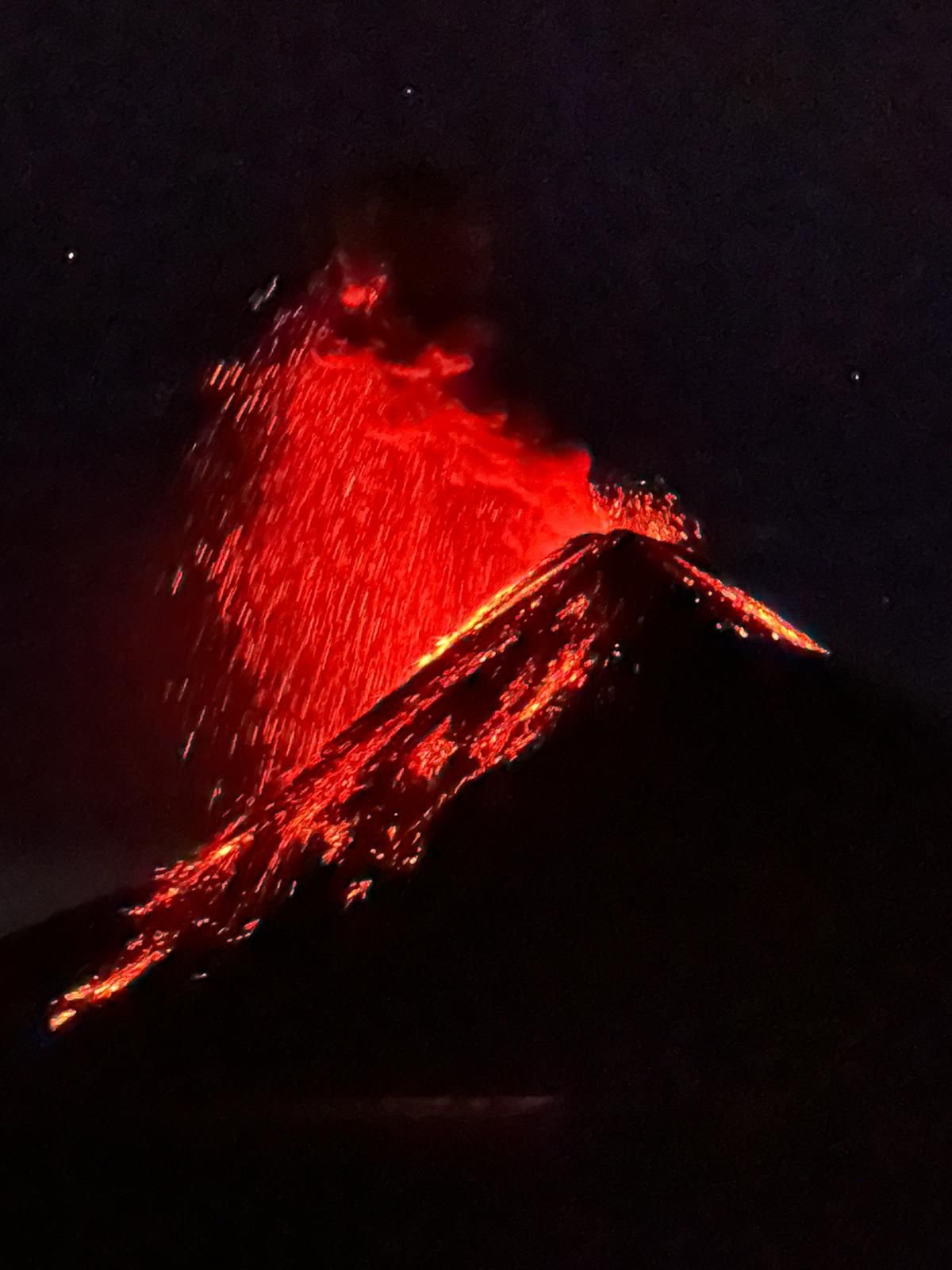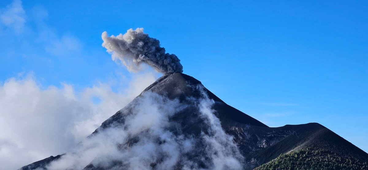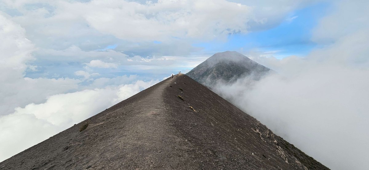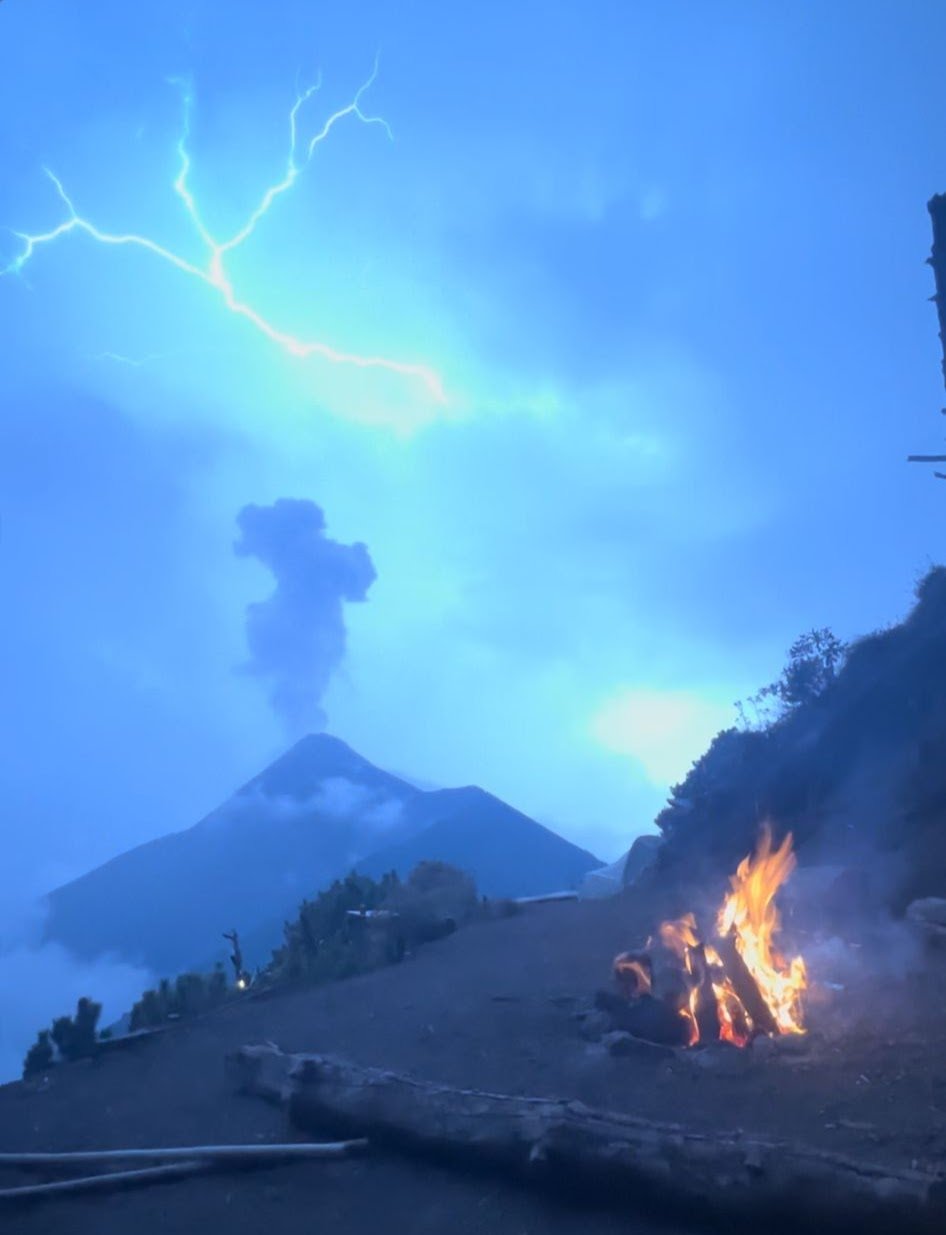 Nach ungefähr vier Stunden kommen wir im Basecamp, zirka 400 Höhenmeter unterhalb des Gipfels vom Vulkan Acatenango an und können unser Gepäck in einer Hütte deponieren. Unsere Wanderung ist aber noch längst nicht beendet. Wir wollen unbedingt zum Vulkan Fuego, ein aktiver Vulkan. Zuerst geht es 300 Höhenmeter steil nach unten, dann wieder 300 Höhenmeter rauf. Danach wieder denselben Weg zurück. Oben angekommen ist die Aussicht auf den Vulkan einfach grandios.