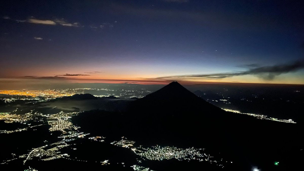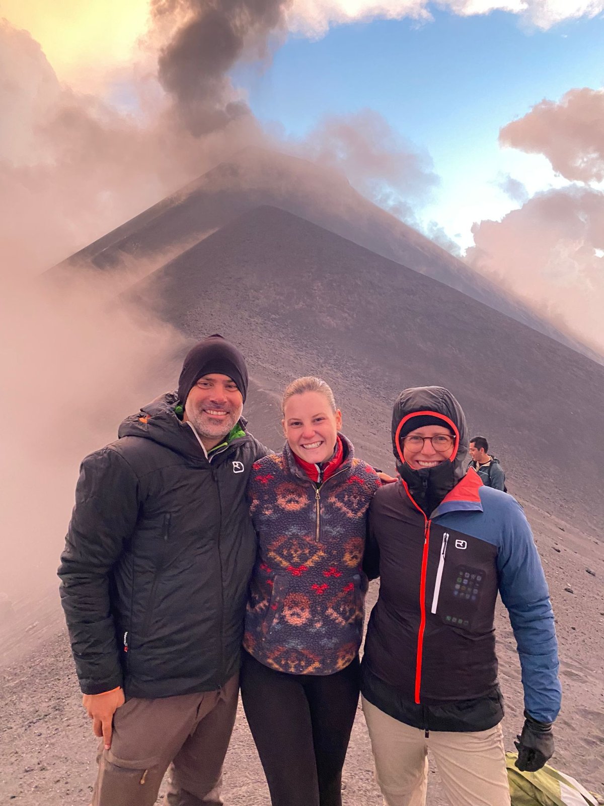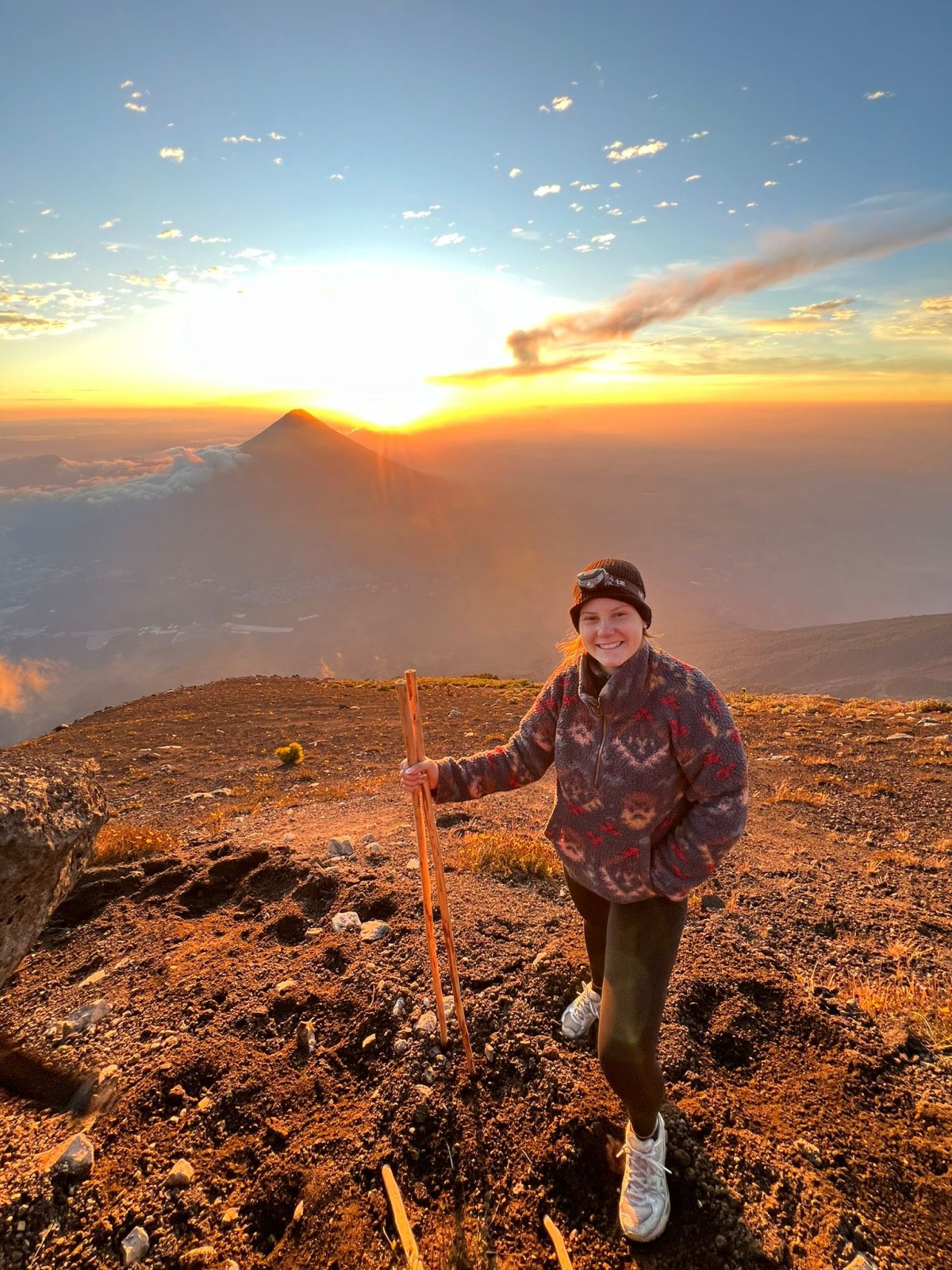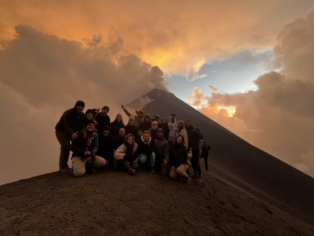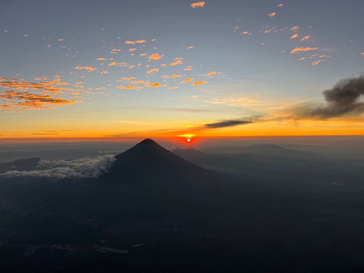 Beim Bascamp angekommen wartet ein warmes Feuer das Essen auf uns was wir hochgetragen haben. Die Meisten gehen früh ins Bett da wir alle kaputt und durchgefroren sind. Trotz vier Schichten Kleider und einem dünnen Schlafsack friert Simone die ganze Nacht. Da sie sowieso wach ist, entscheidet sie sich die Sonnenaufgangstour zum Gipfels des Acatenangos mitzulaufen. Joos bleibt im Bett und ruht sich aus. Sein Körper ist aufgrund des Durchfalls und der Anstrengung völlig ausgelaugt. Der Aufstieg ist wieder sehr anstrengend – die Aussicht auf dem Gipfel zwar wunderschön, aber aufgrund der Kälte leider überhaupt kein Genuss. Unsere Schuhe sind immer noch nass vom Vortag und entsprechend kalt sind unsere Füsse. Von der Temperatur her muss es unter Null gewesen sein, denn der Boden ist gefroren.