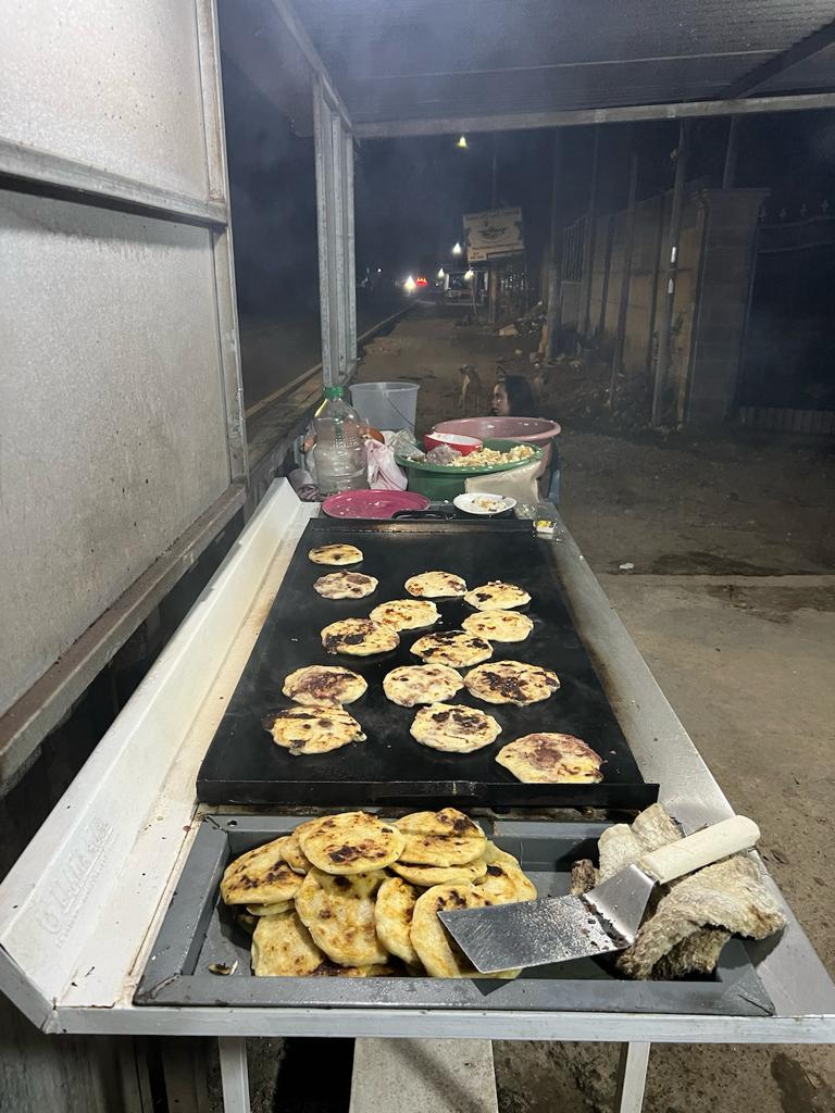 Ein El Salvadorianer sieht uns am Strand campen und spricht uns an, da er an diesem Strand noch nie Touristen gesehen hat. Er spricht ziemlich gut Englisch, da auch er in den 90er Jahren in die USA nach Minnesota geflüchtet ist. Gegen Abend hören wir ein Feuer dem wir am Anfang nicht viel Beachtung schenken. Doch das Feuer wird immer grösser und der Rauch dicker. Der El Salvodorianer ruft seinen Bruder an der direkt neben der Polizei wohnt. Er soll die Polizei informieren. Diese wissen aber bereits Bescheid und sagen es sei nicht weiter schlimm und in dieser Gegend normal. Sobald das Gras abgebrannt ist, wird das Feuer von alleine erlöschen. Unterdessen ist es dunkel und der Bruder steht auch bei uns. Wir haben Hunger und wollen etwas Essen. Im Dorf gibt es nur ein Restaurant und der Streetfood um die Ecke mit Pupusas soll nicht so toll sein. Die zwei Brüder kennen einen besseren Pupusa Stand und nehmen uns mit dem Auto mit.