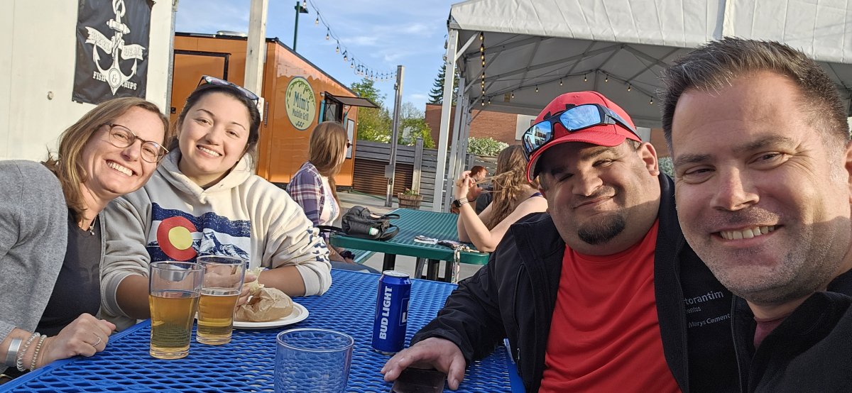 Am späten Nachmittag treffen wir die Cousins Jeremy und Kristina im Back Lot Beer Garden. Das Wetter ist wunderschön und wir sind froh, dass wir draussen sitzen können. Die Atmosphäre ist auch ganz cool. Es gibt da verschiedene Food und Getränke Trucks - mal etwas anderes :-)