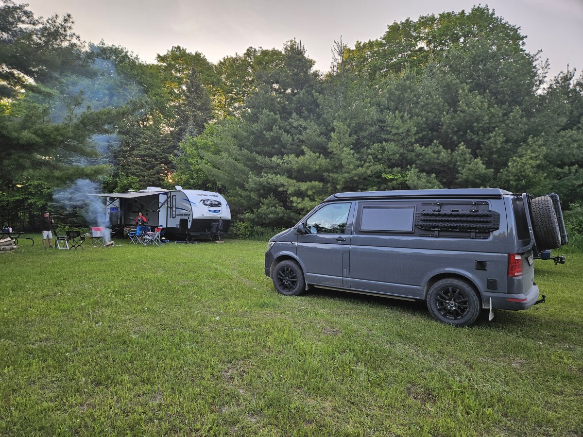 Eigentlich sind aktuell Feuer ohne Feuerring aufgrund der Trockenheit und Brandgefahr verboten. Aus diesem Grunde wird ein 20$ Gasgrill kurzerhand als Feuerstelle umfunktioniert. Der Grill hat zwar gelitten, war aber am nächsten Tag mit Gas wieder einsatzfähig.
