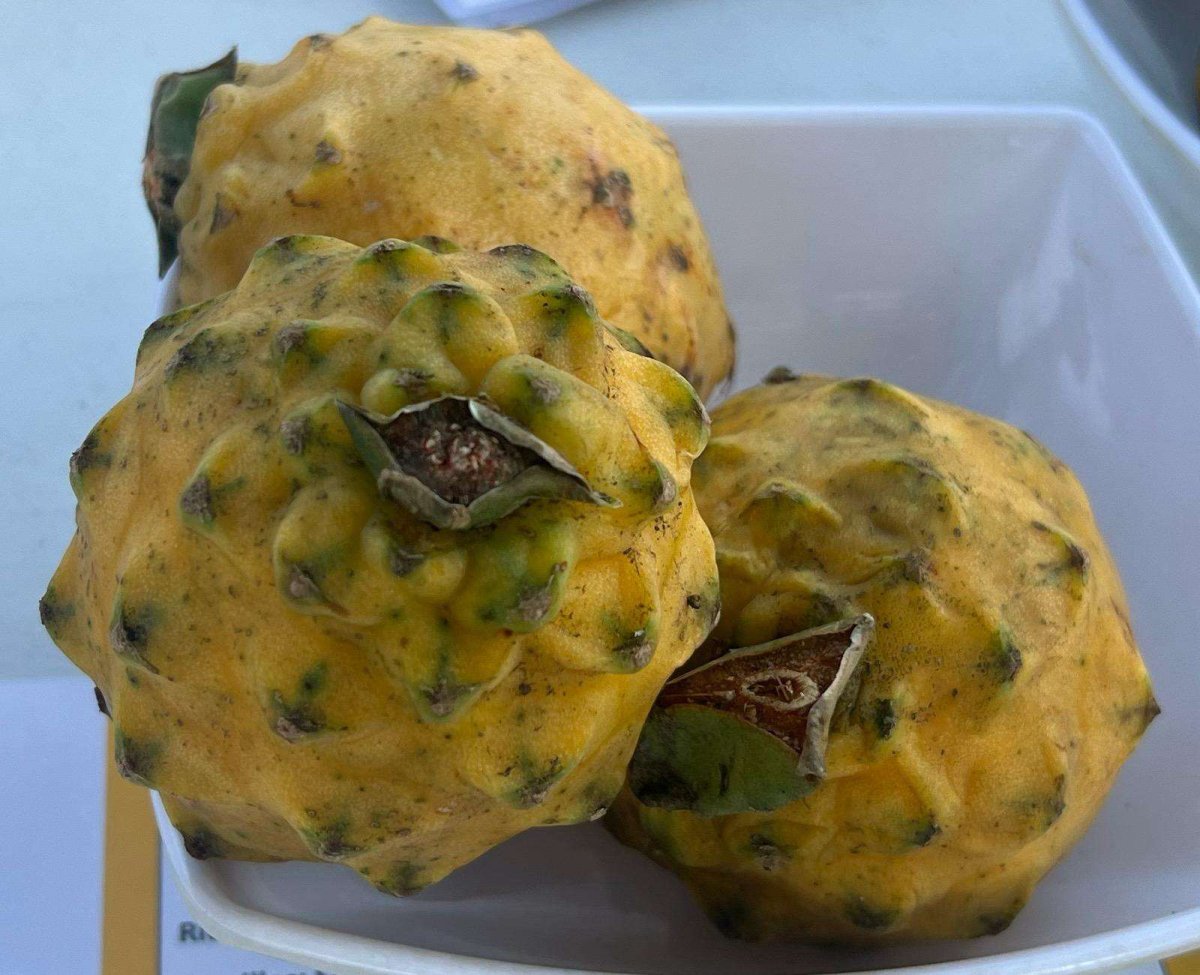 Pitahaya: Ist die gelbe Variante der Dragon Fruit. Die Schale ist gelb und das Fruchtfleisch gelb. Sie schmeckt viel süsser wie die rötliche Variante der Dragon Fruit.