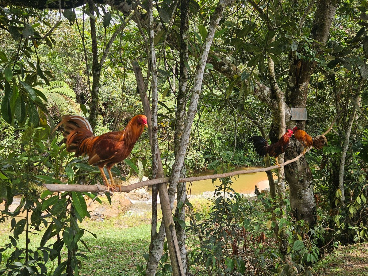 Ein Traumplätzchen haben die hier. Das Einzige das uns stört ist das Gekrähe von gefühlt zwanzig Güggel. Beim Wegfahren sehen wir, dass wirklich ungefähr zwanzig Güggel auf den Bäumen sitzen. Sie sind alle in einer Reihe an einem Ast angemacht. Was machen sie wohl mit diesen? Wir haben keine Ahnung - früh Morgens hätten wir sie gerne geköpft aber jetzt tun sie uns richtig leid.