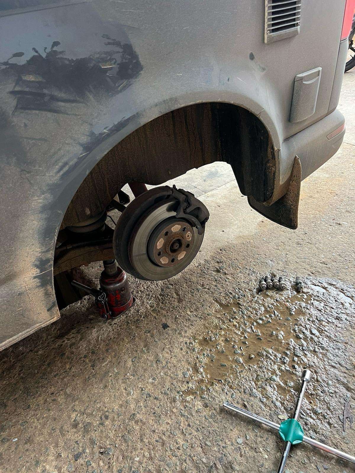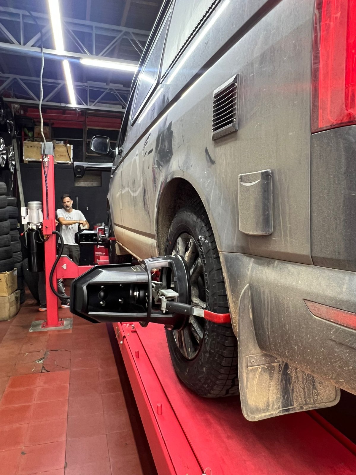 Da die alten Pneus nicht gleichmässig abgenutzt sind wird die Spur noch richtig eingestellt.