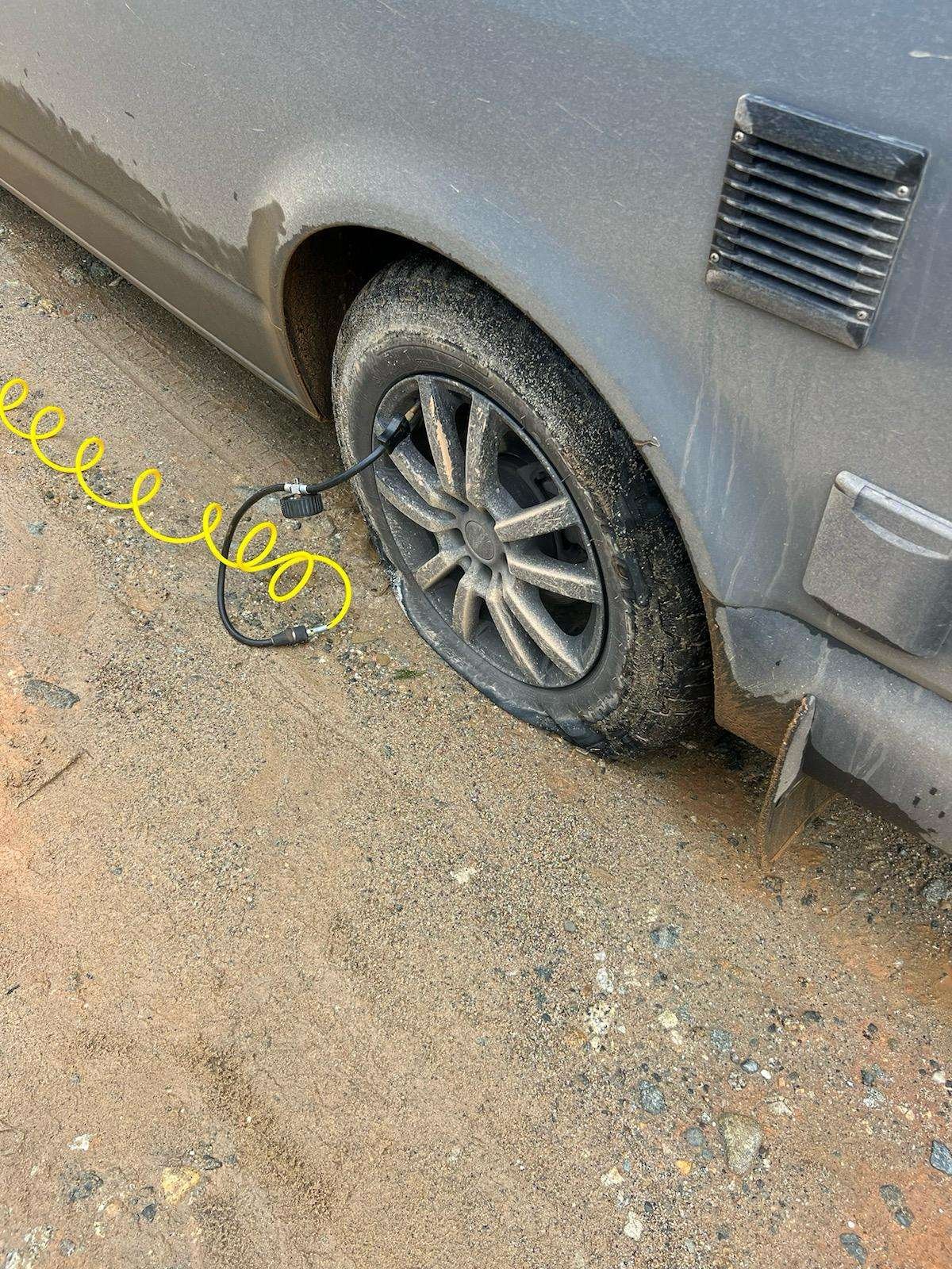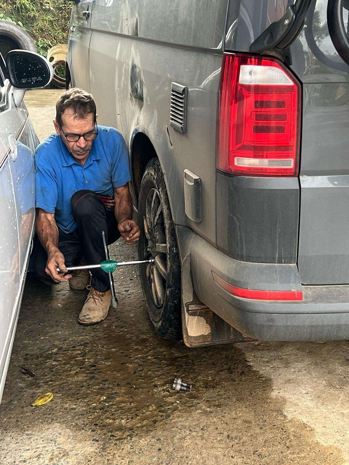 Jetzt werden die neu bestellten Pneus mitten auf der Strasse montiert.