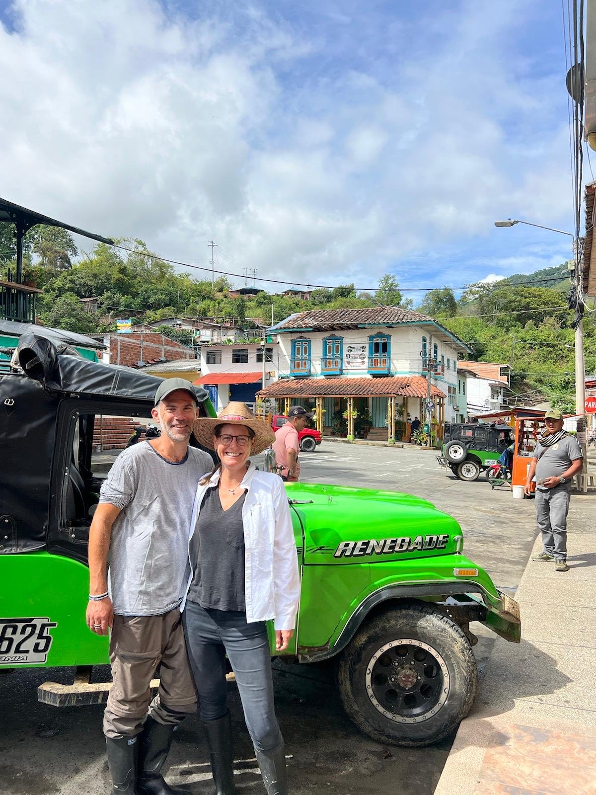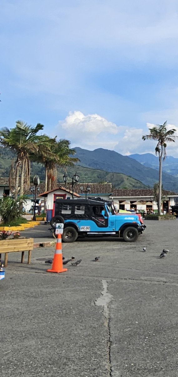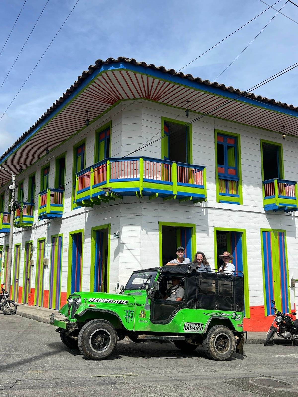 Das Dörfchen ist am Wochenende gut besucht und Parkplätze rar. Deshalb fahren wir mit einem Jeep Taxi ins Dorf. Das Dorf ist herzig und kolumbianisch farbig