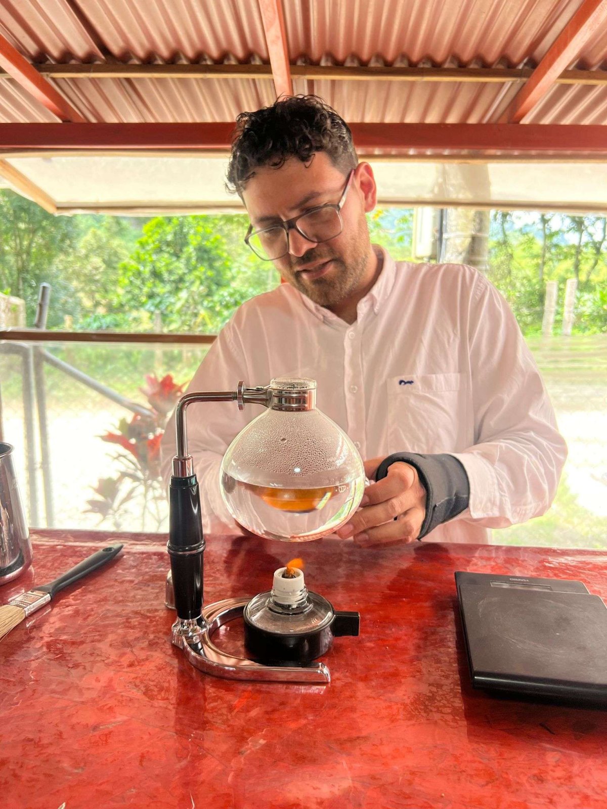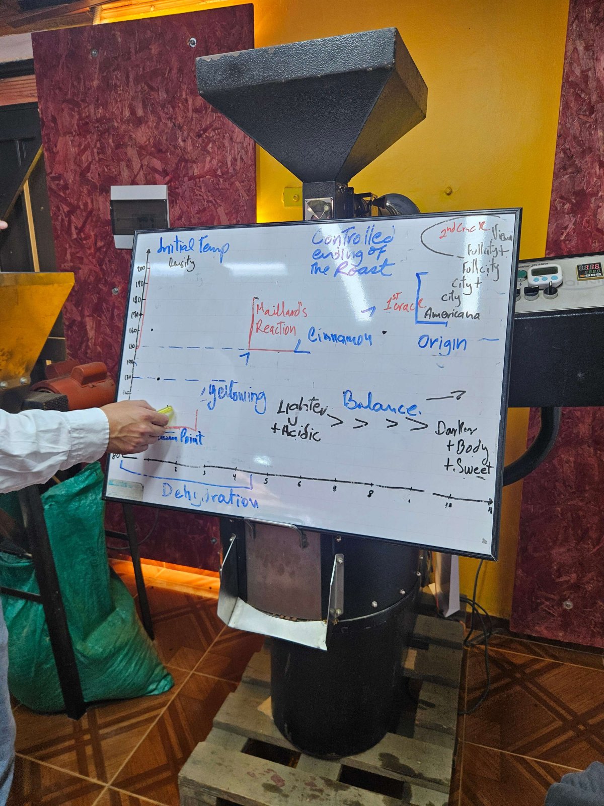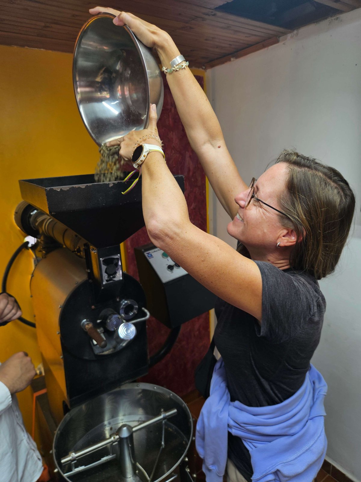 Javier ist bereits ready und zeigt uns, wie der Kaffee geröstet wird, welche Faktoren den Geschmack der Kaffeebohnen beeinflussen.