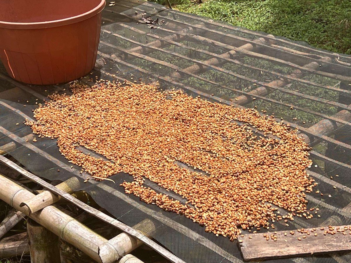 Geschälte, zum trocknen ausgelegte Kaffeebohnen.