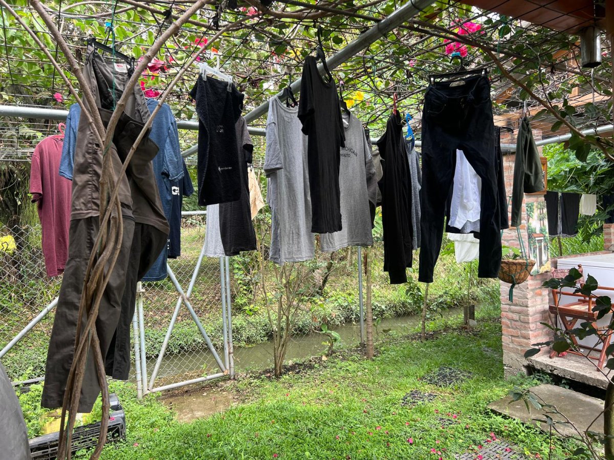 Leider verlässt uns Karin nach zwei Wochen auch schon wieder. Das heisst für uns wir müssen wieder einmal einen Fahrtag einlegen. In der Nähe des Flughafens von Cali können wir auf einer Finca übernachten. Die Besitzer sind super nett und wir dürfen sogar deren Waschmaschine benutzen. Obwohl es immer wieder regnet nutzen wir die Chance und legen einen Waschtag ein. Damit die Wäsche an der Sonne trocknen kann und trotzdem nicht verregnet wird, wird man beim Aufhängen erfinderisch.