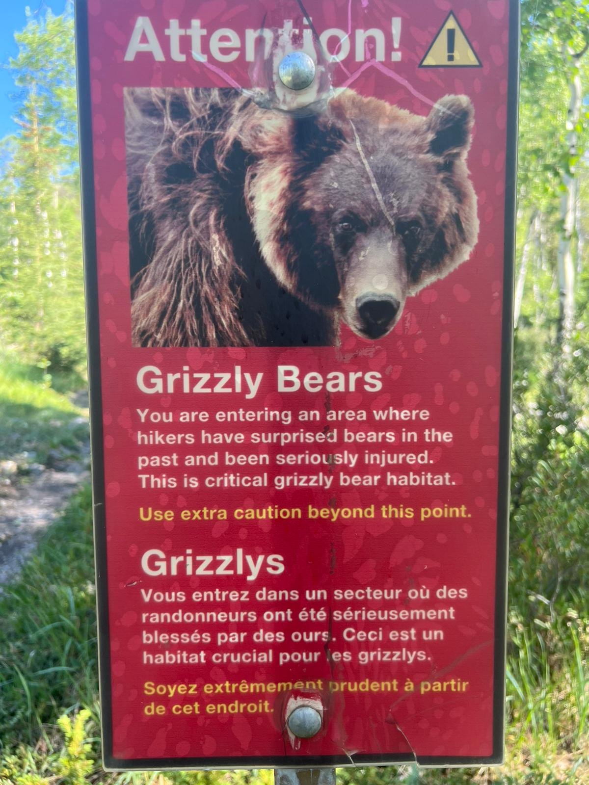 Wir sind mit Bärenglocke und Bärenspray ausgerüstet, da kann uns ja eigentlich nichts passieren. Vor dem letzten Steilstück wartet dann auch ein tolles Schild auf uns. Wir sind uns nicht mehr so ganz sicher, ob wir dieses Gebiet wirklich durchqueren möchten und haben ein ganz mulmiges Gefühl. Insbesondere da uns ein Parkranger gesagt hat, dass man einen Grizzly nur entkommen kann, wenn man mit jemandem unterwegs ist, der noch etwas langsamer ist. Bis jetzt haben wir aber noch keine anderen Wanderer gesehen. Wir stehen also vor dem Schild und sind uns unschlüssig ob wir weitergehen sollen. Dann kommen zwei junge Amerikaner die auch zum Lookout möchten. Sie versprechen uns, die Grizzly zu vertreiben. Nun ja, da mussten wir ja fast loswandern, ansonsten hätte das komisch ausgesehen. Wir wandern also bis zum Lookout und sind froh, dass wir keinem Grizzly begegnet sind. Zum davon rennen war es definitiv zu steil und wir hätten in jedem Fall verloren. Auch gegen die Amis ☹