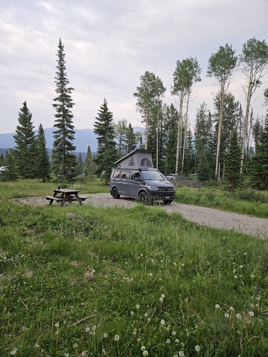 Wir entschliessen uns ausserhalb des Parks wild zu campen. Keine so gute Idee wie es sich herausstellt. Kaum haben wir unser Dach geöffnet, besuchen uns zwei nette Parkranger und machen uns auf die Regeln für Wildcamping in Alberta aufmerksam. Es ist zwar erlaubt, aber man muss einen Camping Pass buchen. Da wir nicht länger vorhaben in Alberta zu bleiben, entscheiden wir uns nochmals auf einen Camping im Nationalpark zu nächtigen. Dies kostet etwa gleich viel, bietet aber fliessend Wasser und Duschen.