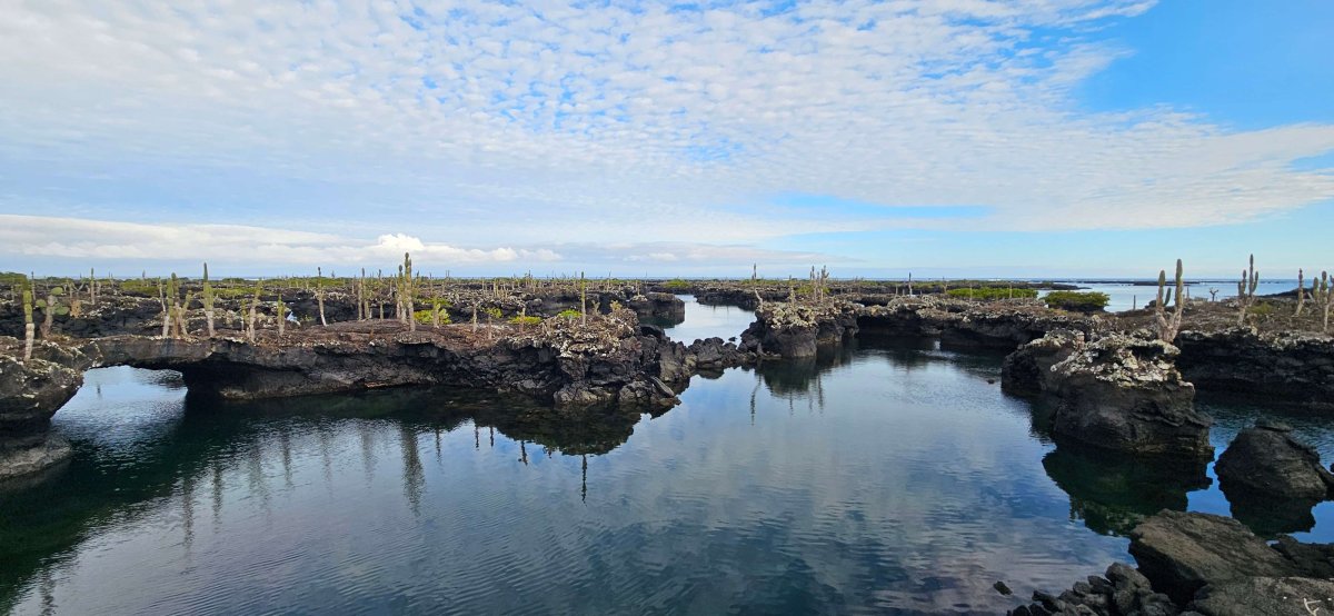 Direkt neben dem Hafen gibt es eine weitere Bucht die gut zum Schnorcheln sein soll. Wir wagen uns dieses mal ohne Neopren kurz ins Wasser. Die Sicht zum Schnorcheln ist etwas besser wie auf Tortuga Bay in Santa Cruz. Allerdings sehen wir weit weniger Tiere. Nur eine Schildkröte und eine Schule Eagle Rays.