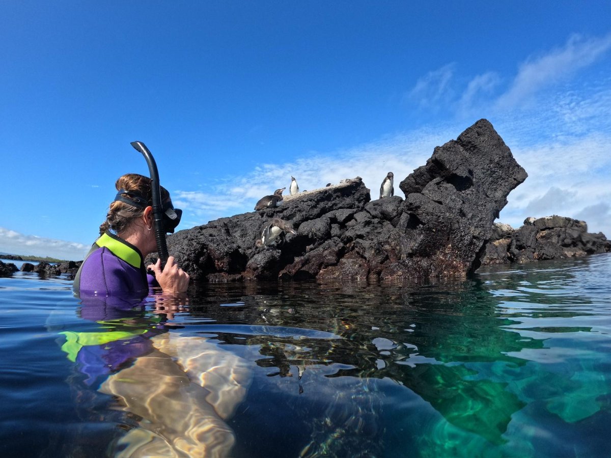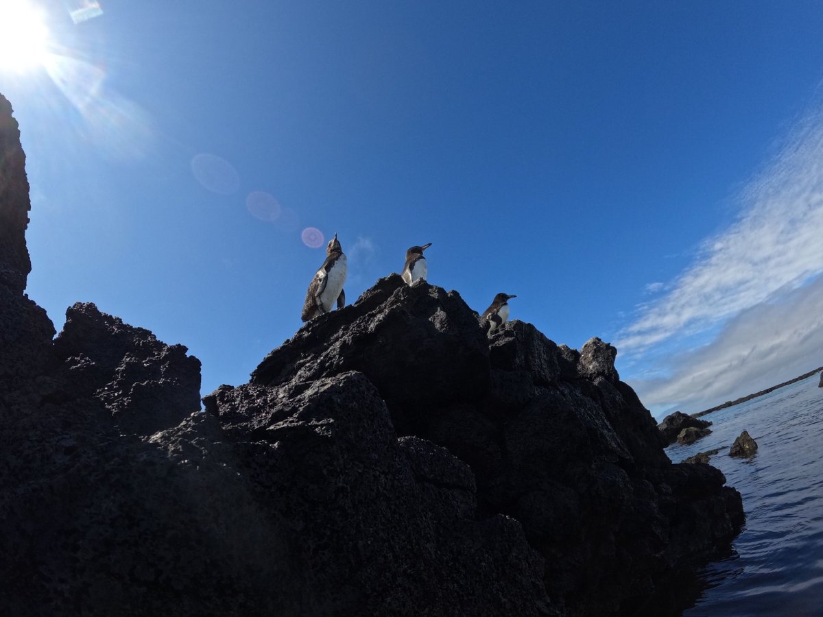 Auf einem kleinen Felsvorsprung warten die Pinguine auf uns. Sie sind klein und herzig. Aber ziemlich schüchtern. Auf dem Land können sie sich nicht wirklich gut fortbewegen – im Wasser sind sie dafür umso flinker. Ein gutes Unterwasserfoto ist eigentlich unmöglich da sie so schnell an uns vorbeiflitzen. Bei den Pinguinen ist das Wasser übrigens speziell kalt und wir halten es nur sehr kurz aus.