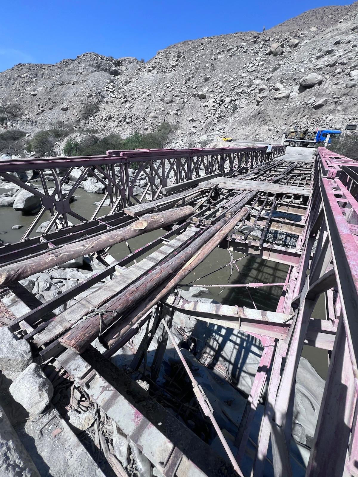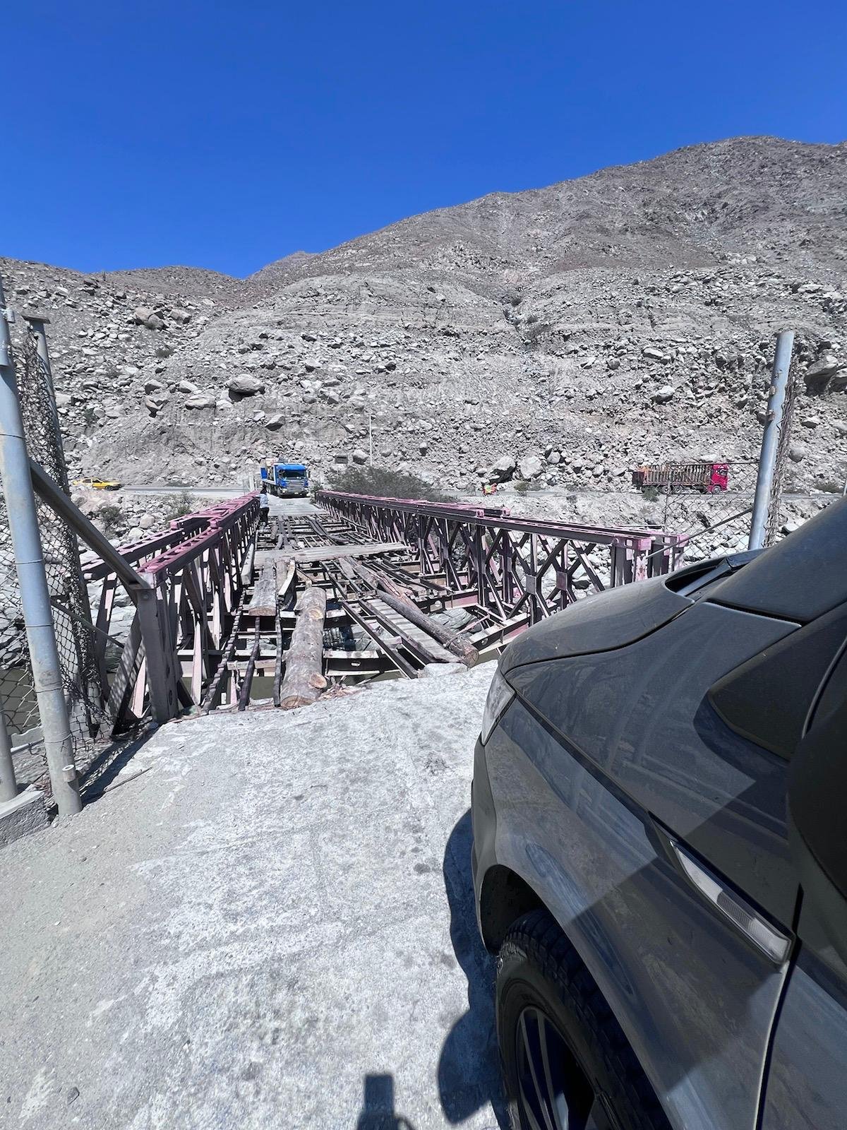 Unsere deutschen Kollegen sind schon etwas weiter und schreiben uns, dass die Gegend schlimmer und die Strasse Richtung Cañon del Pato richtig schlecht wird. Nach dieser WhatsApp wundern wir uns schon etwas, dass die Strasse auf der wir fahren perfekt und super neu ist. Aber vielleicht sind sie ja sehr viel weiter und die schlechte Strasse kommt noch. Was uns auch etwas stutzig macht ist der Fakt, dass wir praktisch keinen Gegenverkehr haben. Irgend etwas kann hier nicht stimmen. Das Rätsel wird gelöst sobald wir auf die Brücke treffen die so löchrig ist, als dass es Selbstmord wäre da rüber zu fahren.