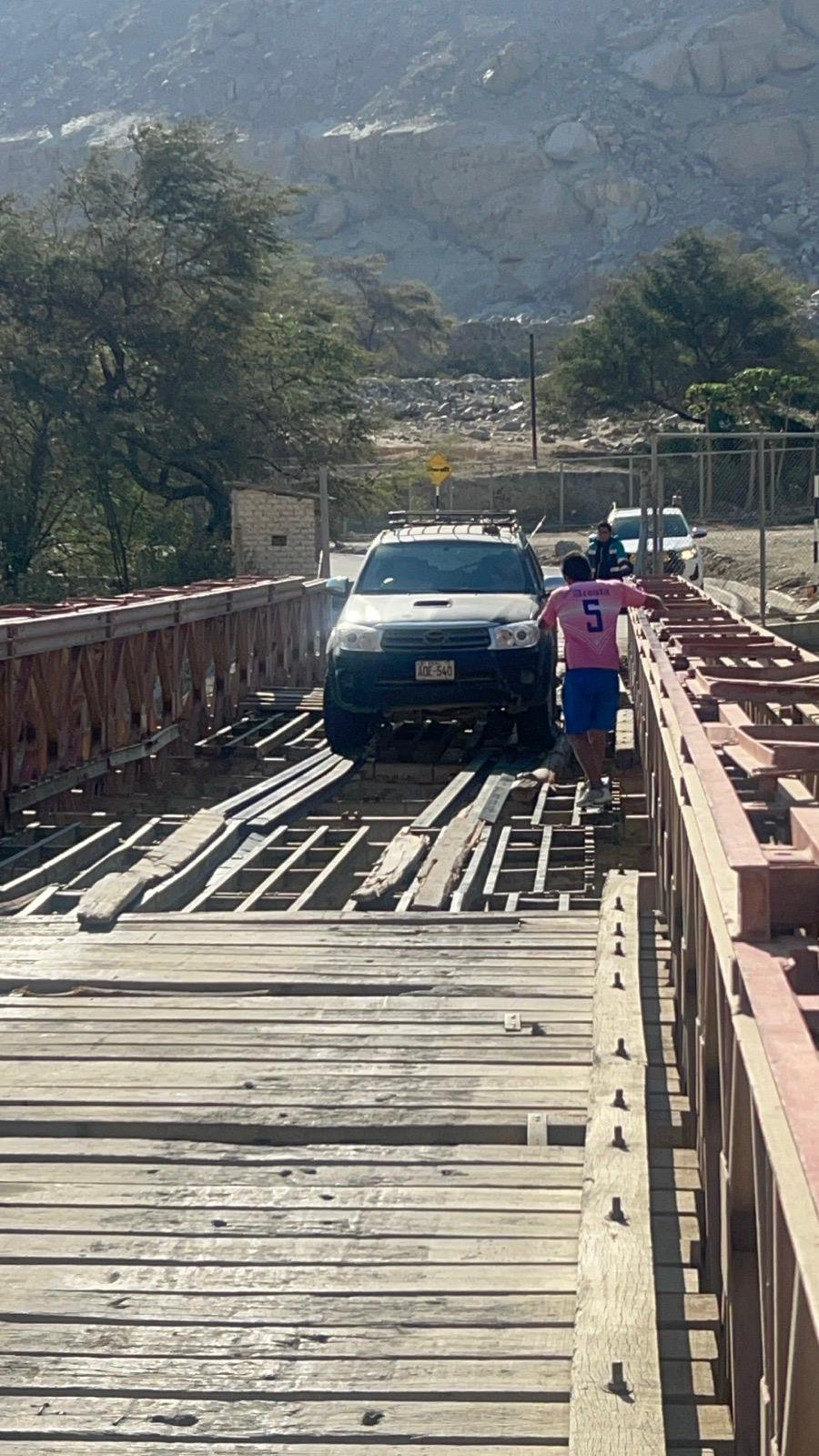 Auf der anderen Seite der Brücke wieder angekommen treffen wir tatsächlich auf Peruaner die Millimeter für Millimeter über die Brücke fahren. Man erinnere sich an die grossen Löcher auf der anderen Seite.