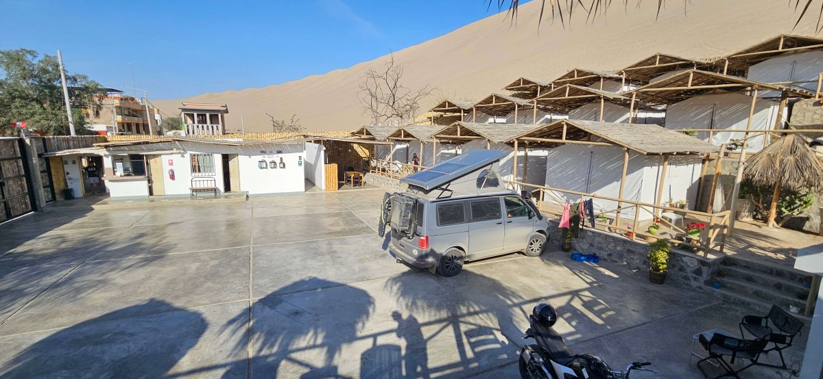 In Lima wechseln wir unseren Ersatzpneu. Jetzt sind wir wieder ready für weitere Abenteuer. Bis wir aus der riesigen Stadt rausgefahren sind, dauert es eine Weile. In der Region Ica werden Trauben angebaut die dann zu Pisco verarbeitet werden. Leider finden wir keinen geeigneten Winzer bei dem man degustieren und gleich übernachten kann. Jä nu, dann bleibt uns wohl nur die Happy Hour. Da kann man jeweils auch ganz guten günstigen Pisco Sour konsumieren 😉. Ganz in der Nähe von Pisco befindet sich das Reserva National de Paracas. Da man im Reserva nicht übernachten darf, übernachten wir gleich am Rande des Parks. Bald gesellen sich auch unsere bekannten Deutschen und Franzosen zu uns.
