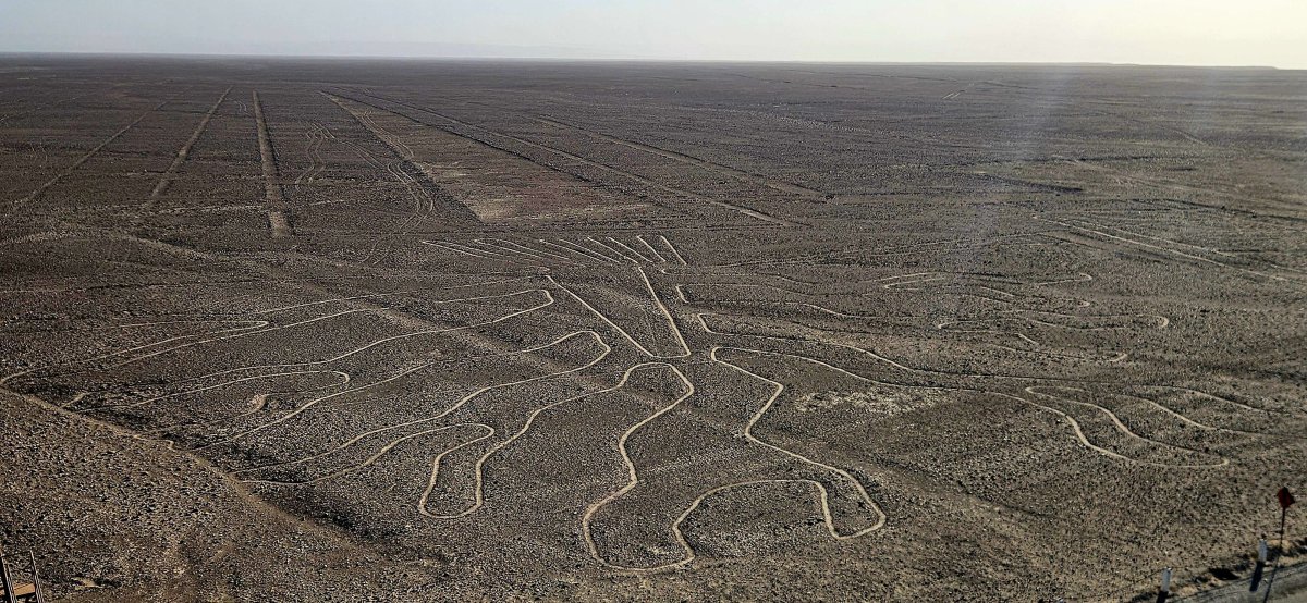 Sich vorzustellen wie diese Linien und Bilder in dieser Grösse vor ca. 2500 Jahren innerhalb von 1'000 Jahren über Generationen gebaut wurden, ist wahnsinnig. Es gab ja noch keine Flugzeuge oder Drohnen die einem zeigen, was man gerade in XXL Format gezeichnet hat. Einen Flug über die Bilder leisten wir uns nicht. Da in der Region über 1'500 Linien und Bilder verewigt sind, finden wir ein paar unbekanntere Figuren über die wir die Drohne fliegen lassen können.