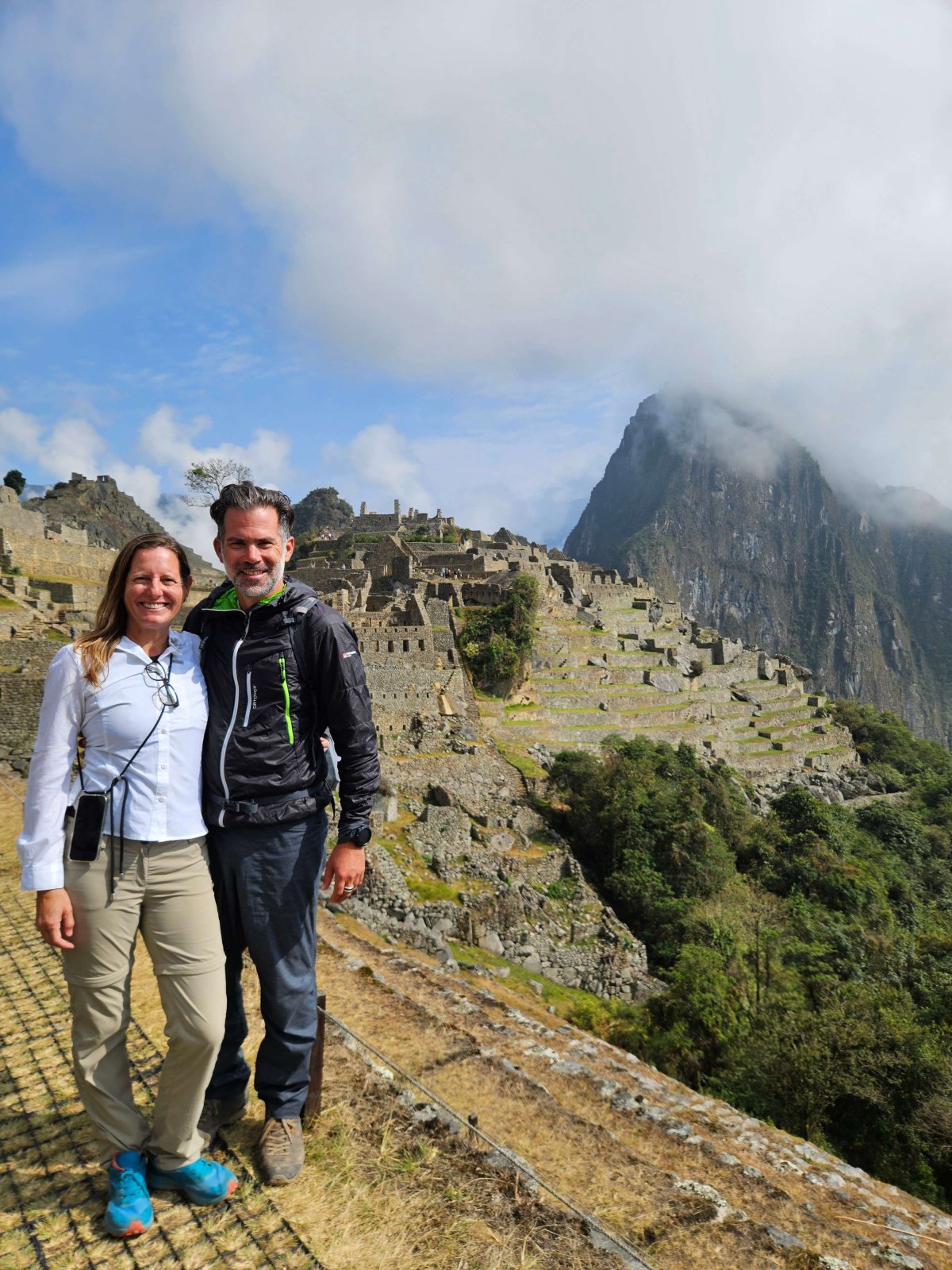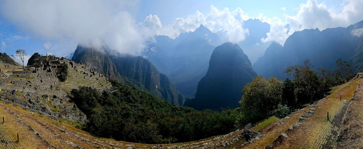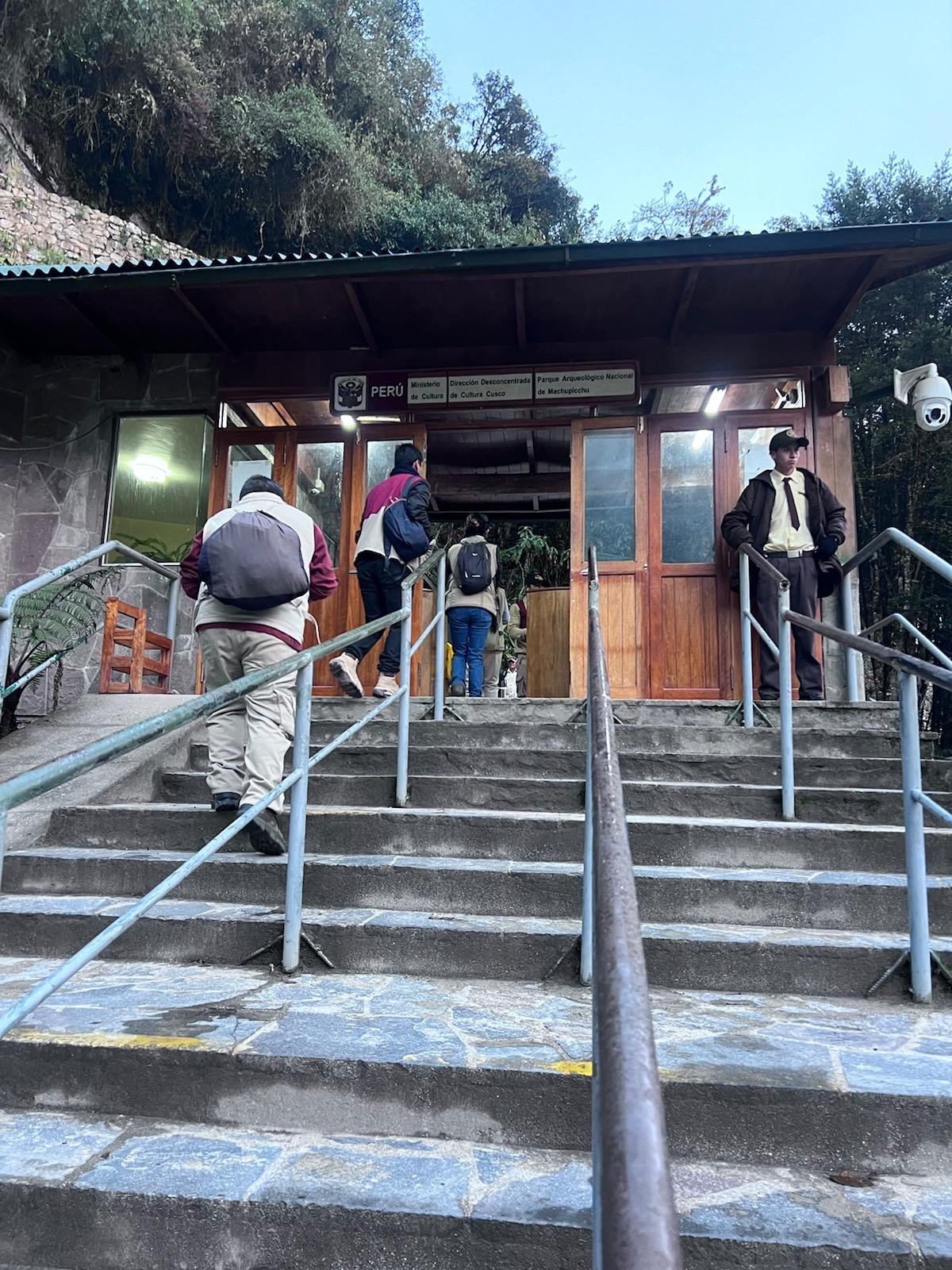 Zum Glück ist es dunkel und wir sehen nicht wie steil es wirklich ist. Gefühlt 4’000 Treppenstufen und ¾ Stunden später haben wir den Aufstieg geschafft und sind die ersten beim Eingang des Machu Picchus. Yes, wir haben sogar Glück und der Himmel ist blau.