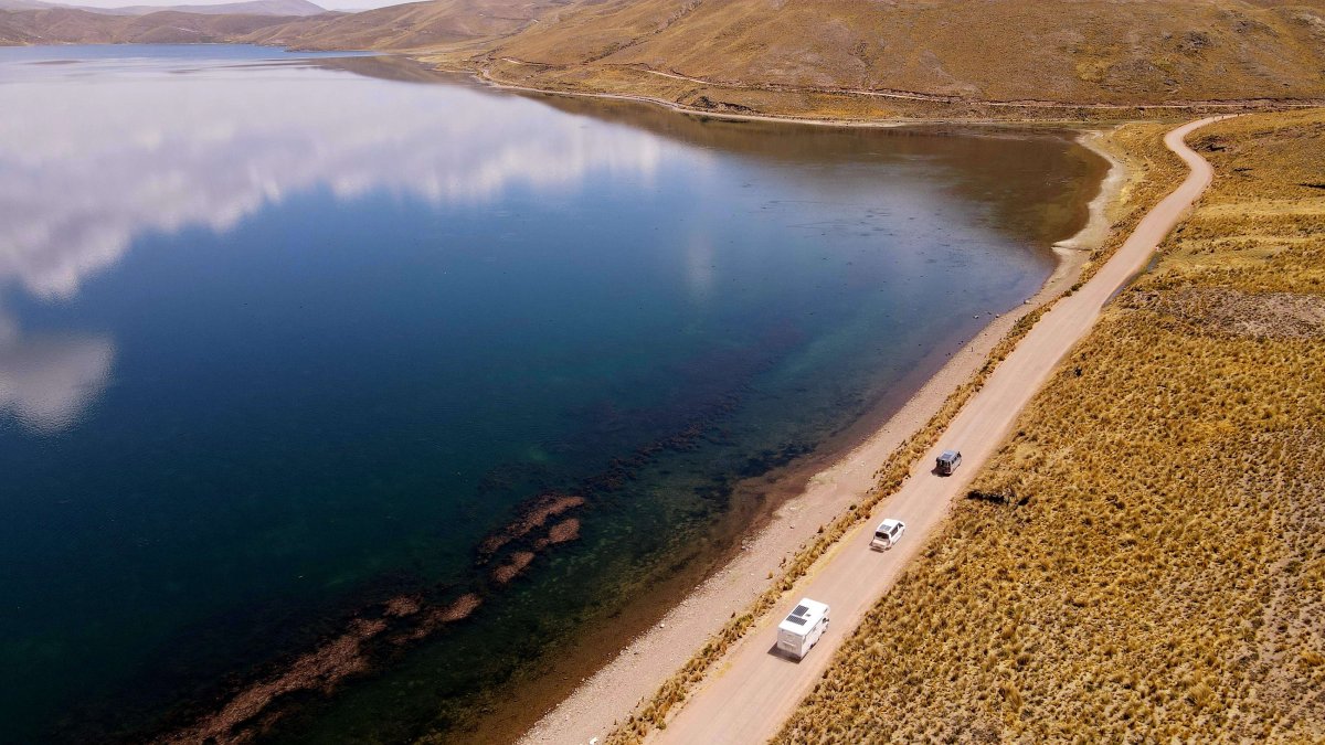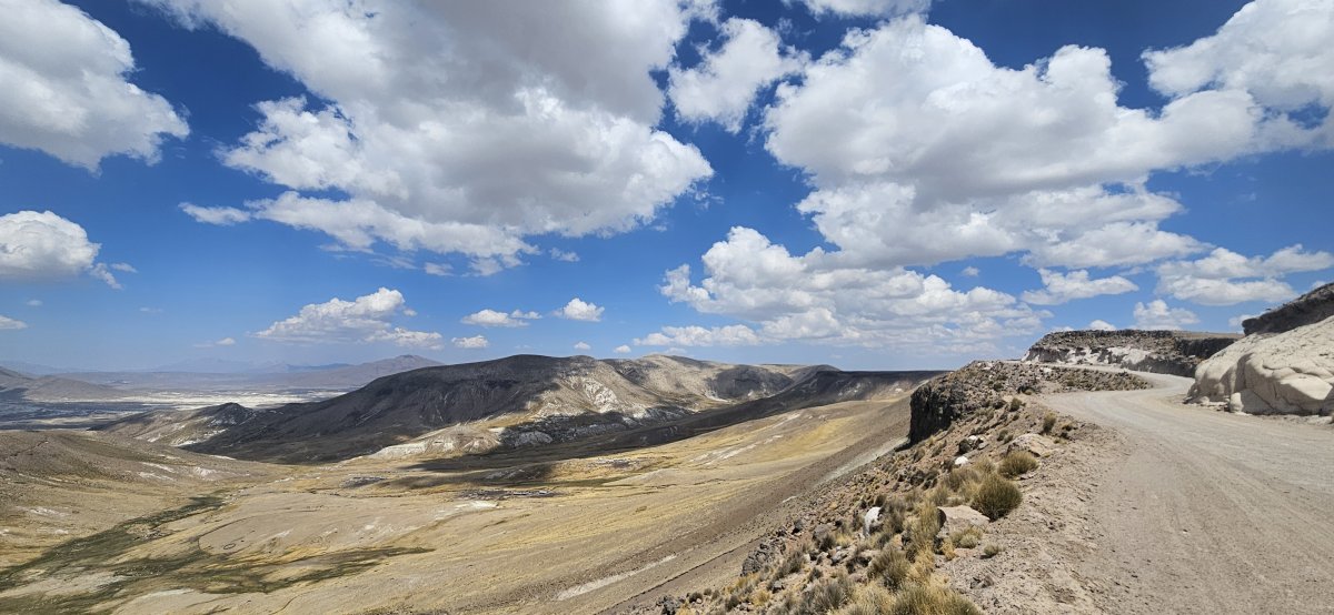 Am nächsten Morgen fahren wir ziemlich früh los. Die Fahrt durch das Altiplano der Anden ist wieder wunderschön. Bei einer Kreuzung zeigt uns die rechte Route eine Zeitersparnis von 40 Minuten an. Klar, dass wir den kürzeren Weg nehmen. Da es auch gerade so schön aussieht, lassen wir die Drohne fliegen.