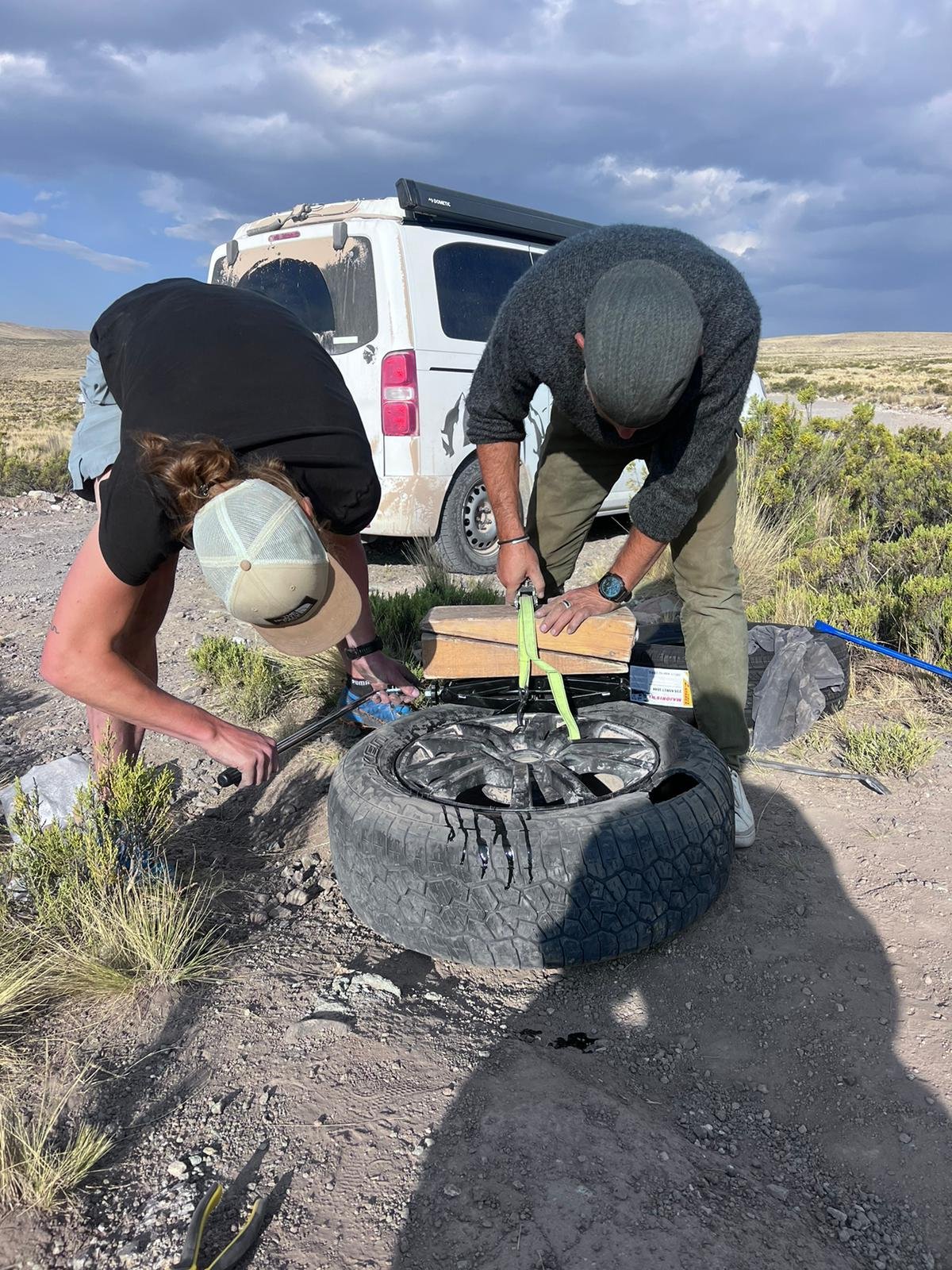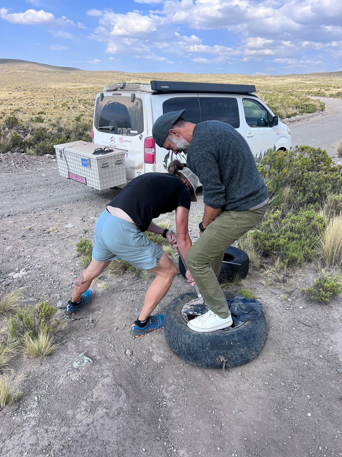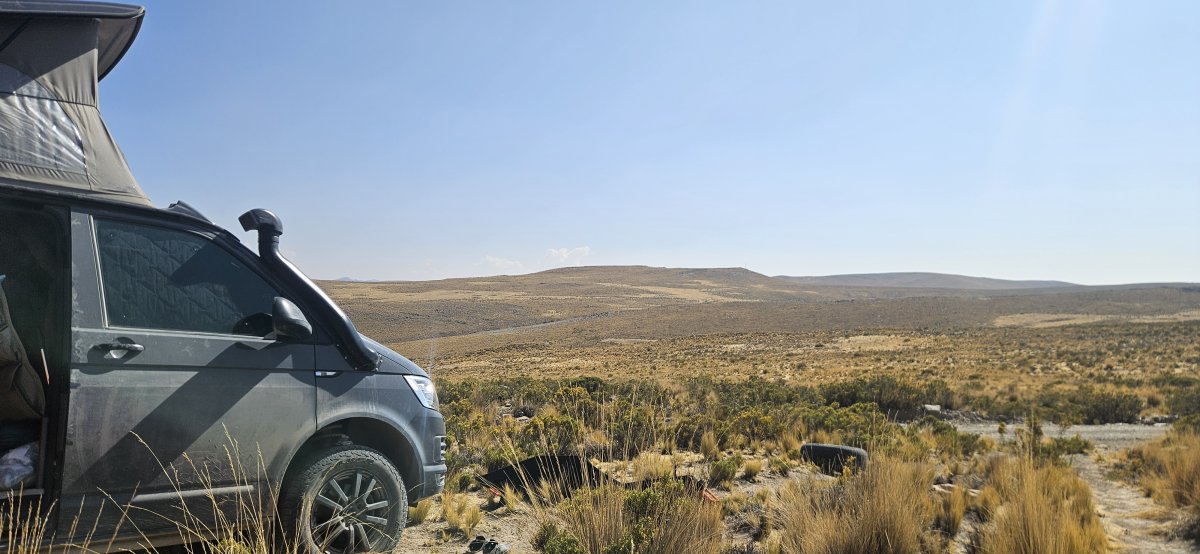 Am Abend wird es jeweils schnell frisch deshalb geniessen wir den kleinen Apéro im Bus unserer Retter. Plötzlich klopft es an der Tür - die Franzosen sind eingetroffen. Auch sie hatten einen Platten und haben es mit Ersatzrad knapp zu uns geschafft. Das Ersatzrad und die restlichen Pneus sehen bei Ihnen auch sehr mitgenommen aus. Da wir niemanden zurücklassen wollen, fahren wir im Convoi zur nächstgrösseren Stadt Puno.