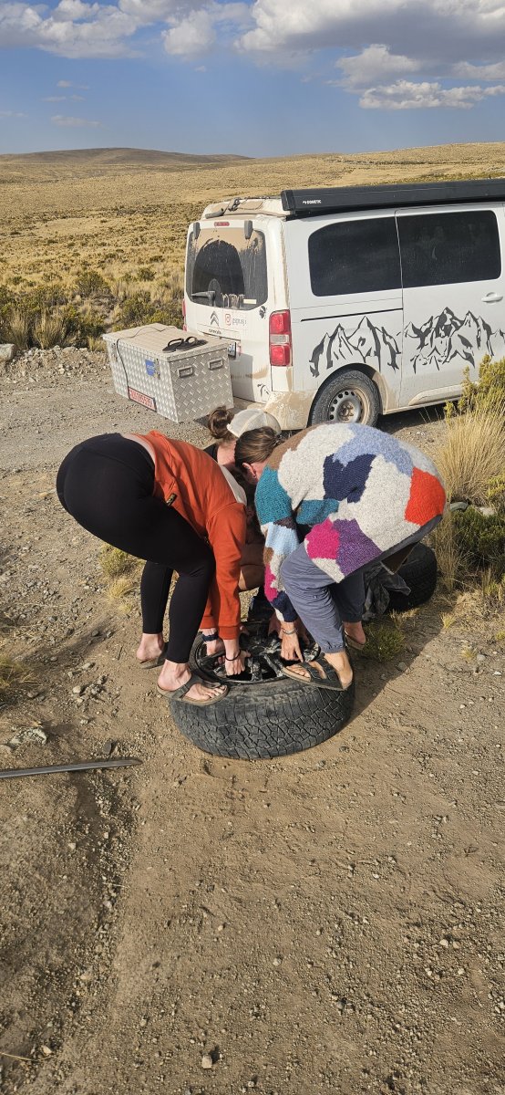 Zum Glück haben wir unterdessen auch beim Reisen ein mehr oder weniger grosses Netzwerk aufgebaut. Die Wallisser, die wir am Salzsee getroffen haben, sind bereits in Puno und wollen uns einen neuen Felgen mit entsprechendem Pneu besorgen. Leider ist ein Felgen in der richtigen Grösse mit der richtigen Lochung in Puno nicht zu finden. So kaufen Sie einfach einen billigen Pneu und leihen bei der Werkstatt das entsprechende Werkzeug aus damit wir den Pneu selber wechseln können. Danach fahren sie 2.5 Stunden zurück um uns zu helfen.