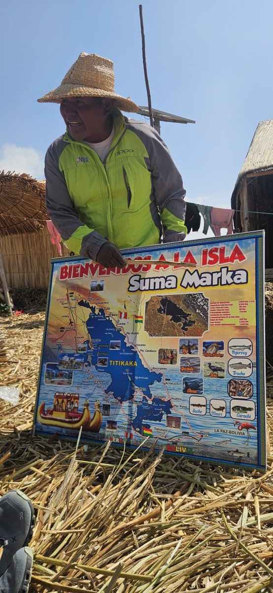 Titicaca wird korrekt Titikaka ausgesprochen, ist Aymara und heisst übersetzt: Titi = Puma / kaka = grau so soll der See die Form eines Puma Kopfes haben. Aber dazu braucht man wirklich eine überirdische Vorstellungskraft. So einfach sieht man dies nicht. Wie auch immer, wenn man beim Titicaca See ist muss man fast zu den Uros Inseln. Obwohl wir uns auch diesen Ausflug sehr gut überlegen, da es doch sehr touristisch ist und man sich bei der Besichtigung etwas wie im Zoo vorkommt. Da der Ausflug sehr billig ist, entscheiden wir uns diesen trotzdem zu machen. Eine Bootsfahrt auf dem See kann ja auch nicht so schlecht sein. Auf der iOverlander App finden wir dann auch eine Privattour mit Yourdi und Mama Rosa.