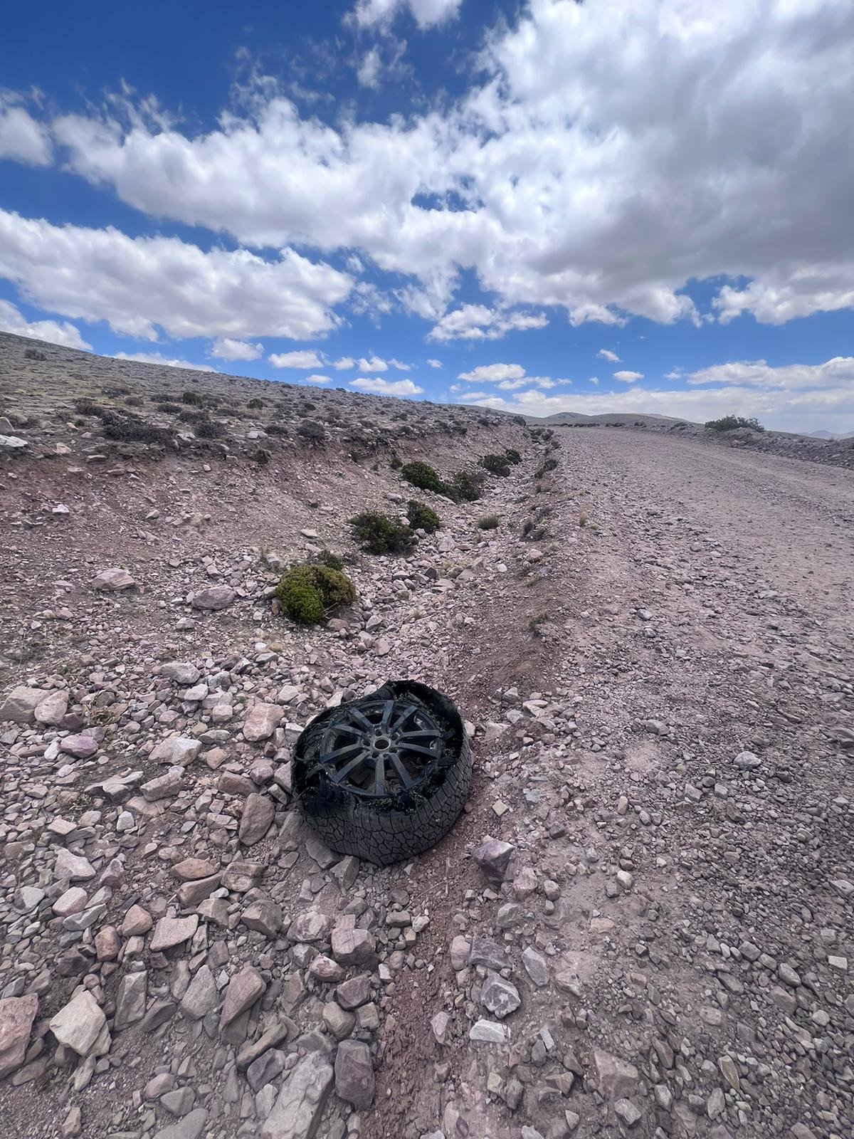 Als erstes zeigt uns das Display an, dass ein Druckverlust der Pneus nicht angezeigt werden kann. Komische Meldung. Selbstverständlich prüfen wir daraufhin alle Reifen und entdecken nichts. Zehn Minuten später prüfen wir nochmals und alles ist immer noch perfekt. Dann fährt Simone und rutscht in der Kurve weg. Danach poltert es. Wir steigen Beide aus und stellen mit Schrecken fest, dass wir gleich bei beiden Hinterreifen einen Platten haben. Zum Glück können wir den einen Pneu flicken. Der Andere ist aber leider mehr wie dahin. Selbst die Felge kann man nicht mehr gebrauchen. Zum ersten Mal werden wir in Peru zu Abfallsündern. Nach dem Radwechsel lassen wir den Felgen mit dem zerrissenen Pneu einfach liegen.
