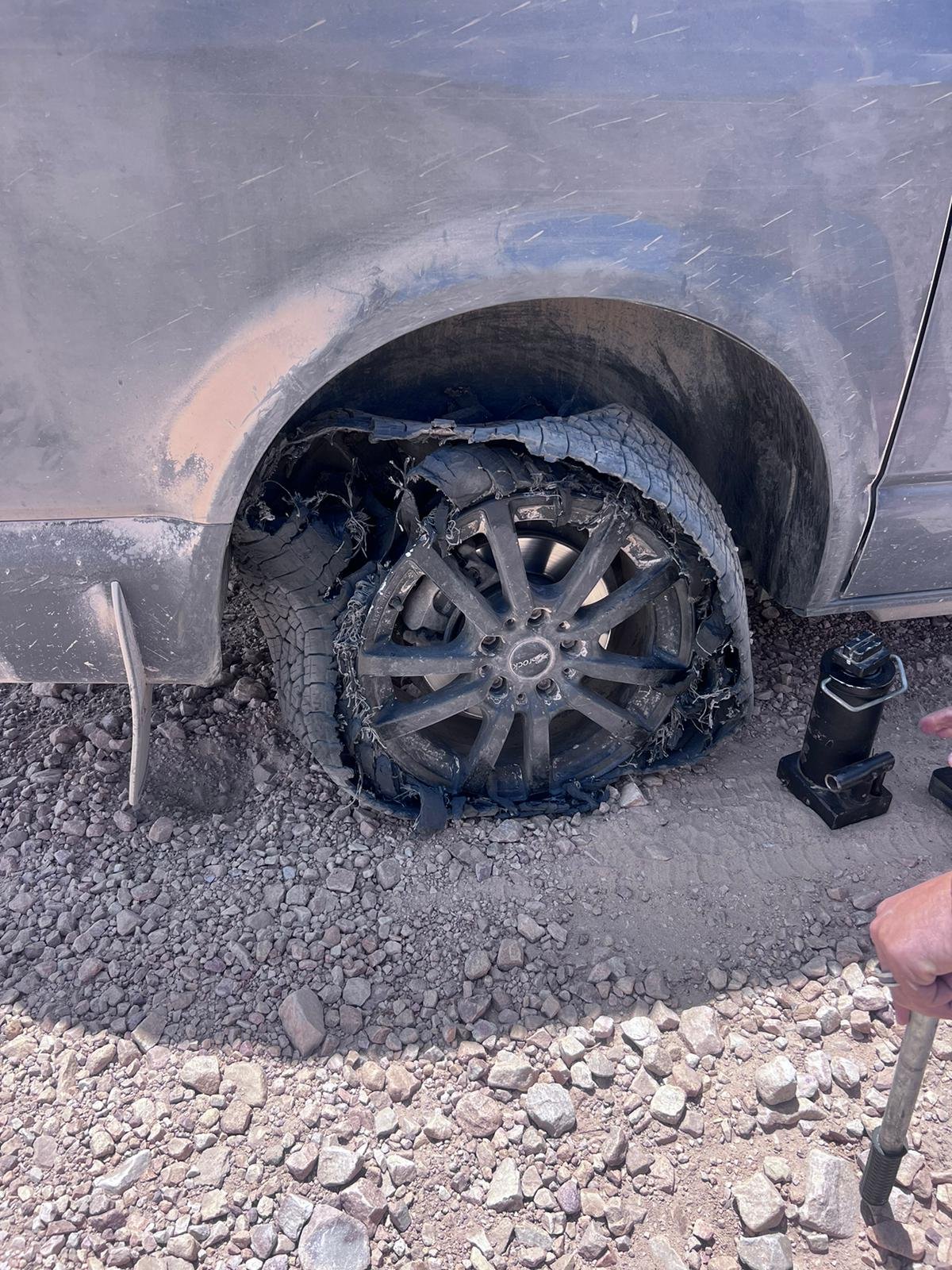 Der eingeschlagene Weg soll ja eigentlich kürzer sein – da die Strasse aber immer schlechter wird und wir unseren Pneus nicht trauen, kehren wir um. Dann passiert es. Der gewechselte Reifen hat auch ein Loch das wir nicht mehr reparieren können. Es ist einfach zu gross. Der Alptraum – drei kaputte Pneus innerhalb einer Stunde. Wie kann das passieren. Eine Erklärung haben wir leider keine. Die Strasse ist auch gar nicht so schlecht. Der Druck in den Reifen hat gepasst, schnell sind wir nicht gefahren – hat jemand eine andere Idee? Es hilft alles nichts, wir müssen jemanden organisieren der uns hilft.