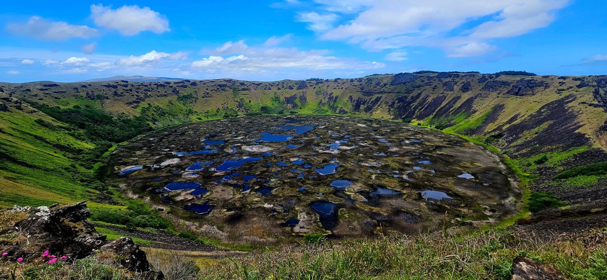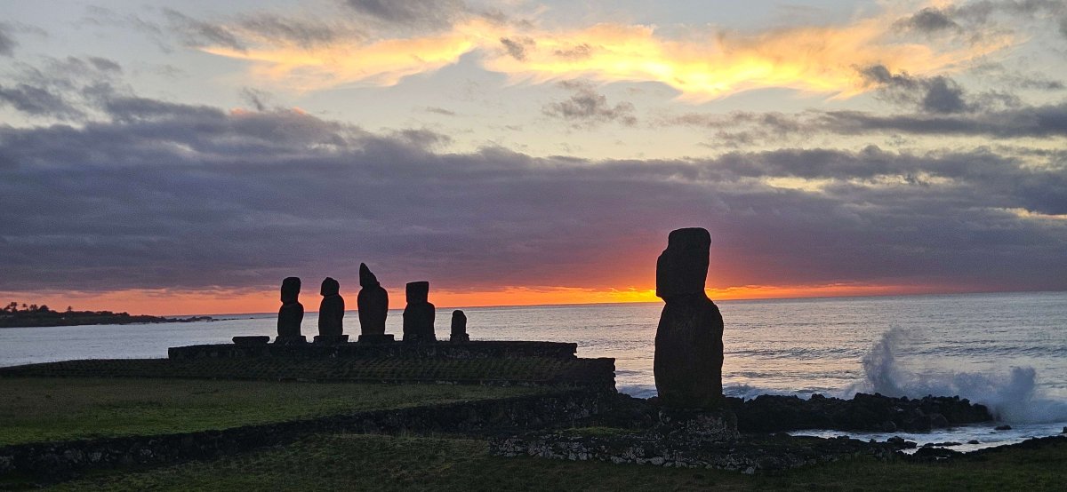 Auf Rapa Nui werden wir von der Besitzerin des AirBnBs mit einer Blumenkette empfangen und erhalten als erstes eine kurze Führung durch das Dorf. Auf der ganzen Insel verteilt leben ungefähr 9'000 Einheimische. Jeden Tag sind zirka 600 Touristen auf der Insel. Ausser wenn die Kreuzfahrtschiffe ankommen dann sind es ungefähr 3'000 Touristen die einen Tag bleiben. An so einem Tag ist man dann lieber nicht auf der Insel. Die Kreuzfahrtschiffe sind deshalb bei den Einheimischen nur mässig beliebt. Ausser dem Parkeintritt bringen diese der Insel kaum einen Mehrwert. Normalerweise essen und übernachten diese nicht auf der Insel.