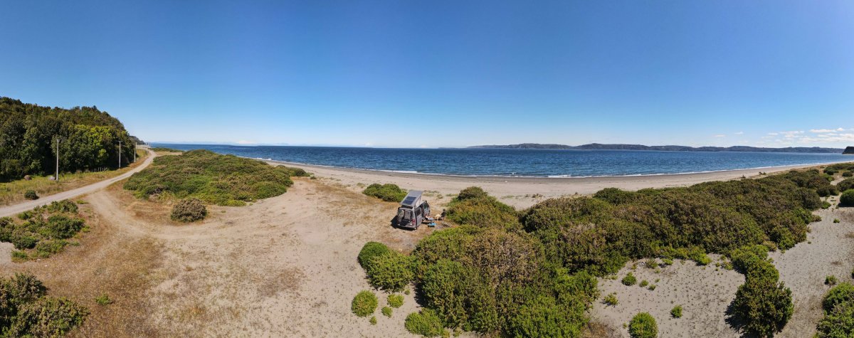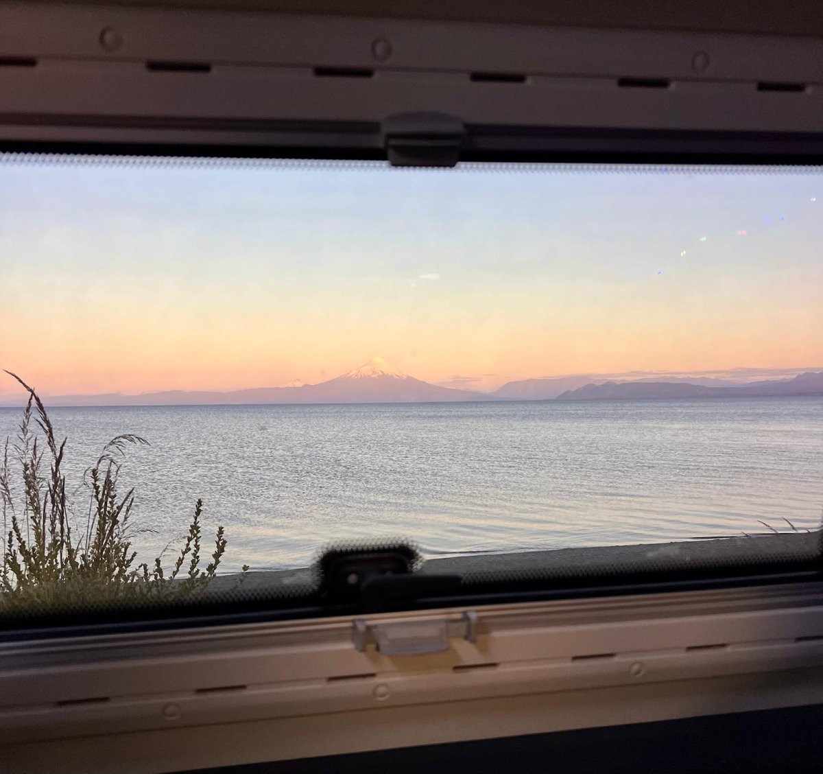 Am See von Llanquihue geniessen wir von unserem Schlafzimmer aus die perfekt Aussicht. Die Aussicht hat aber wie immer seinen Preis, den wir erst am Abend realisieren. Am Nachmittag sind wir noch fast die einzigen am Strand. Am Abend füllt sich dieser aber mit Chilenen. Ein Pickup entschliesst sich mal wieder direkt neben uns zu drehen und trägt mit seinen Rädern die halbe Böschung hinter uns ab. Danach sind wir total eingestaubt. Herzlichen Dank aber auch 😊.