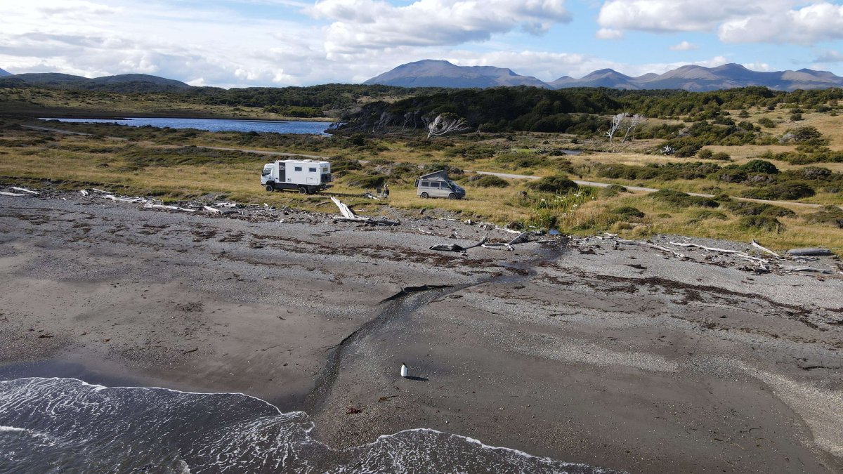 Diesen Stellplatz am Beagle- Kanal haben wir nur aus einem Grunde ausgewählt. Seht ihr den Grund? Kleiner Tipp, ziemlich klein und weiss am Strand. Etwas rechts von der Mitte.