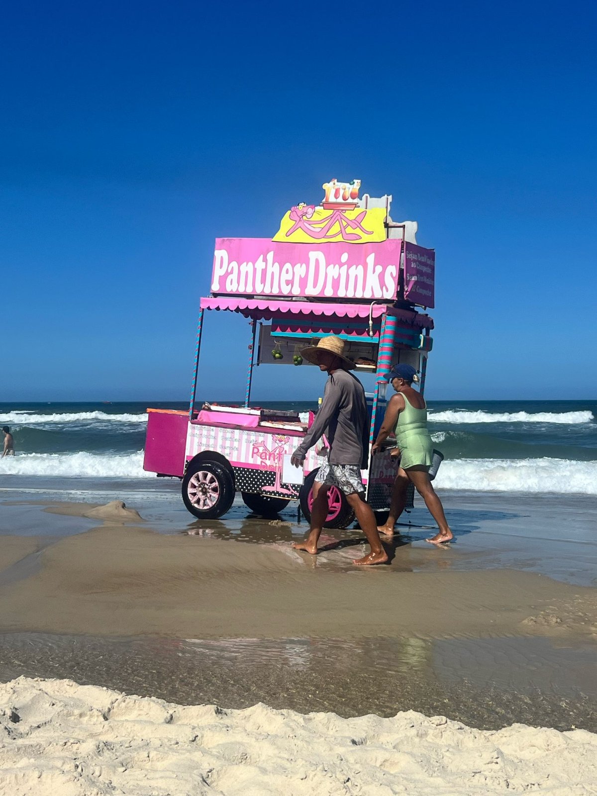 Am Strand fehlt es einem an nichts. Es kommen immer wieder Leute vorbei bei denen man Essen bestellen kann oder es gibt auch Wagen mit denen sie vorbeifahren die den Choripán (Chorizo und Brot – ähnlich wie ein Hotdog aber gegrillt) direkt am Strand mit Holzkohle grillen. Caipirinha gibt es selbstverständlich auch. Mit dem Alkohol sind die hier auch gar nicht geizig. Deshalb wundert es auch nicht, dass wir nach zwei Caipirinhas mehr wie bedient sind. Einige trinken offensichtlich etwas mehr wie die zwei die wir hatten und sind ganz schön besoffen. Eine junge Frau ist so voll, dass sie sich immer wieder setzten muss. Wenn ihre Freundin nicht auf sie achten würde, wäre sie wohl schon komplett nackt da sie immer wieder versucht sich auszuziehen. Die Freundin sucht dann auch bei uns Hilfe. Leider sprechen wir kein Portugiesisch und verstehen praktisch nichts. Portugiesisch von Besoffenen ist noch einen Tick schwieriger. Irgendwann glauben wir zu verstehen, dass die junge Frau ihre Tochter am Strand verloren hat. So wie sie rumtorkelt wundert uns das nicht. Da die Freundin Hilfe holen möchte, passen wir auf, dass die Besoffene nicht auf die Strasse rennt. Zum Glück kommt bald die Polizei – wir hoffen für sie, dass ihre Tochter gefunden wurde. Den Ausgang der Geschichte kennen wir leider nicht.