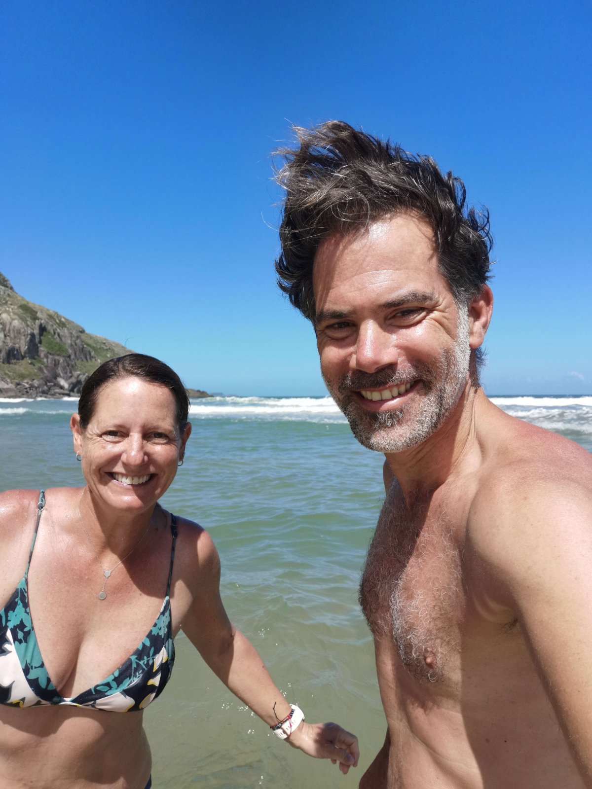 Die Lagohina do Leste soll der schönste Strand im Süden Brasiliens sein. Um dahin zu kommen muss man ungefähr eine Stunde über einen Hügel durch den Dschungel laufen. Bis wir am Strand ankommen sind wir wieder ganz durchgeschwitzt und Joos wagt sich zum ersten Mal ins Wasser.