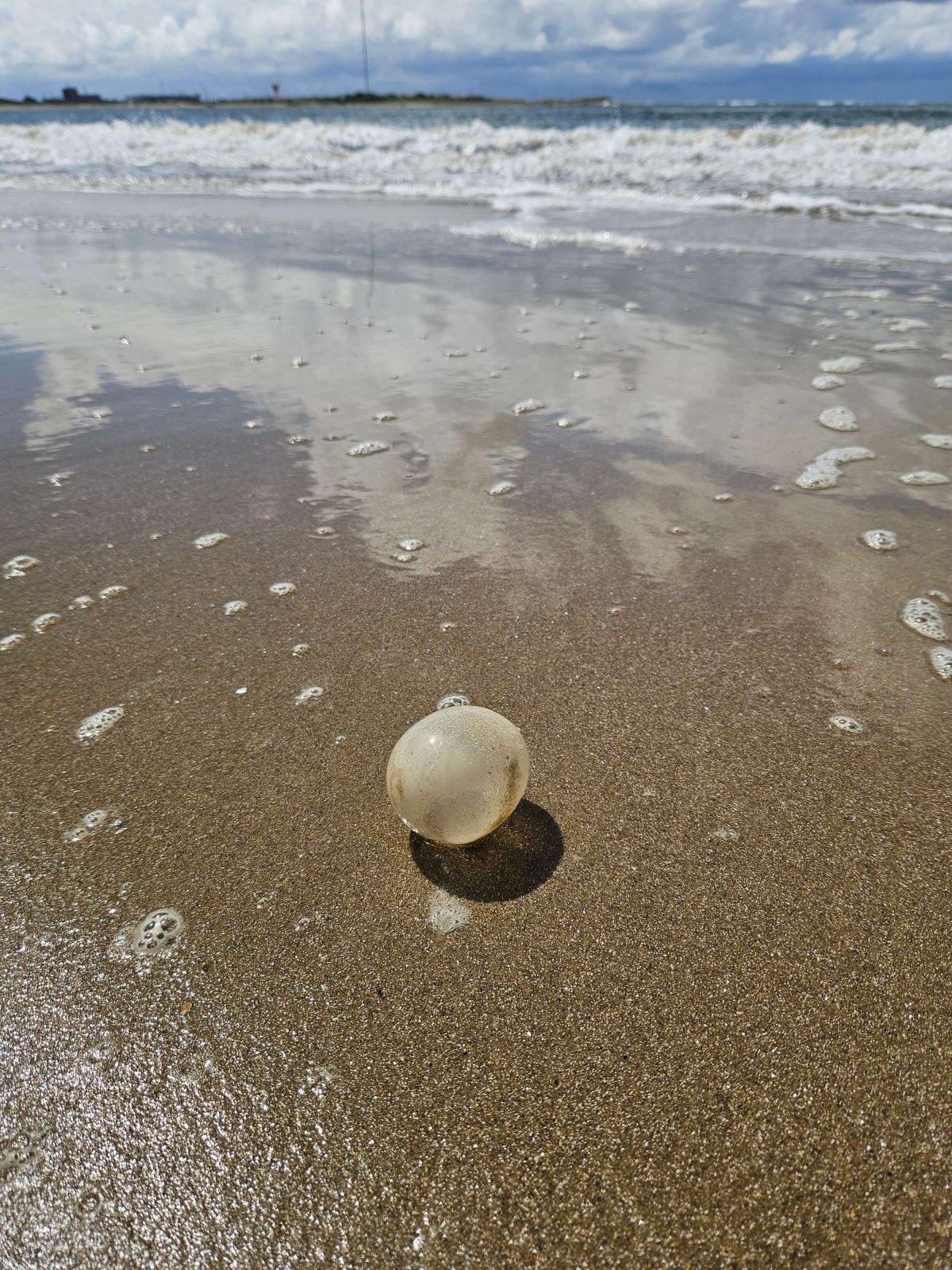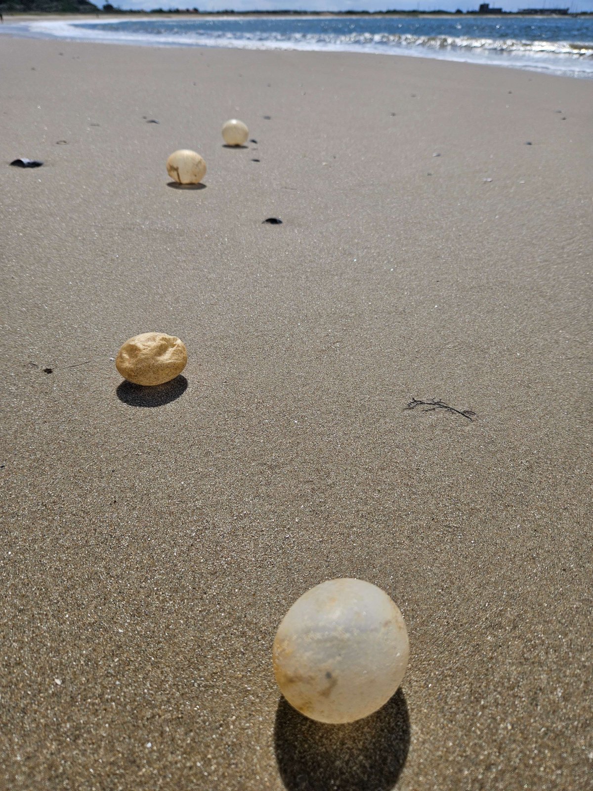 An einem anderen Strand in der nähe von Punta del Este finden wir diese Tennisballgrossen, transparenten Schneckeneier. Die meisten sind leider schon leer und ziemlich ausgetrocknet. Ein paar wenige intakte Eier finden wir aber doch noch. Der Strand muss sehr speziell aussehen wenn von diesen Bällen noch hunderte herumrollen.